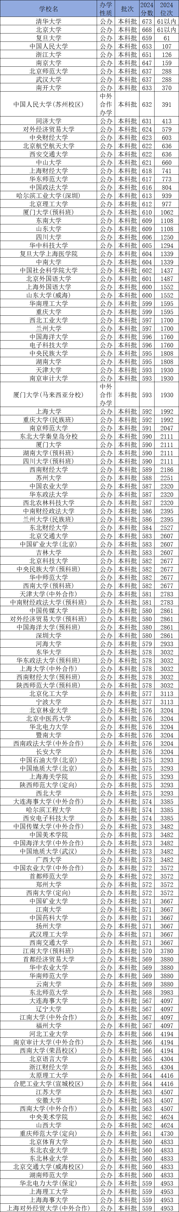 1-5000名范围内,最高位次院校为清华大学,2024年录取位次是61名以内,录取分数线是673分;