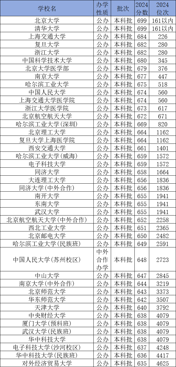 1-5000名范围内,最高位次院校为北京大学、清华大学,2024年录取位次是161名以内,录取分数线是699分;
