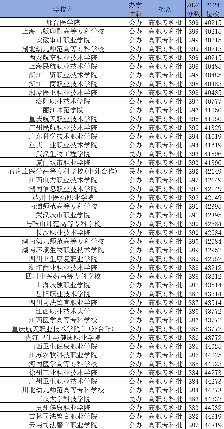 4万-4.5万名范围内,最高位次院校为邢台医学院、上海出版印刷高等专科学校、安徽审计职业学院等,2024年录取位次是40215名,录取分数线是399分;