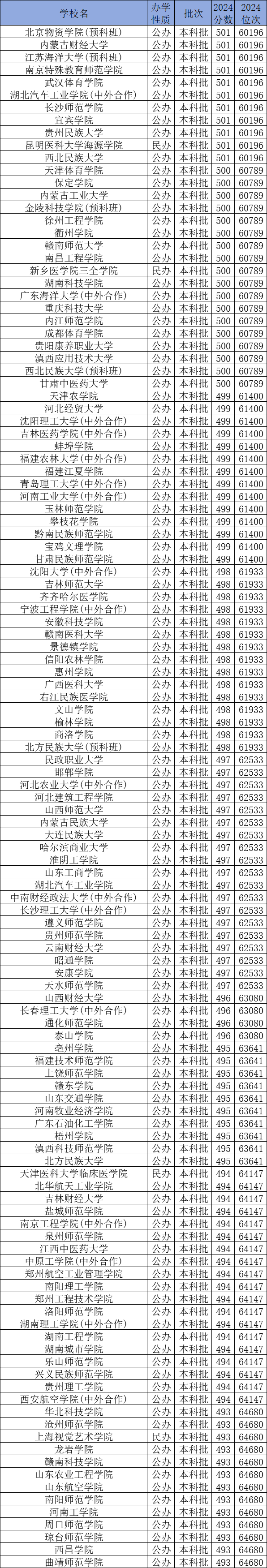 6万-6.5万名范围内,最高位次院校为北京物资学院(预科班)、内蒙古财经大学、江苏海洋大学(预科班)等,2024年录取位次是60196名,录取分数线是501分;