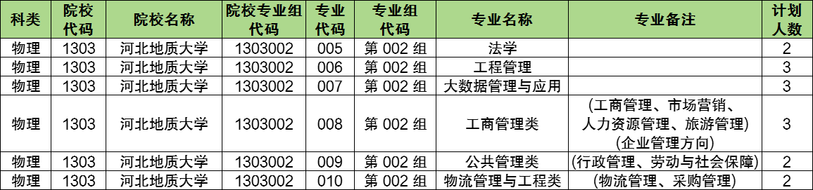 第002组:专业组代码为1303002,包含专业法学、工程管理、大数据管理与应用、工商管理类、公共管理类、物流管理与工程类。