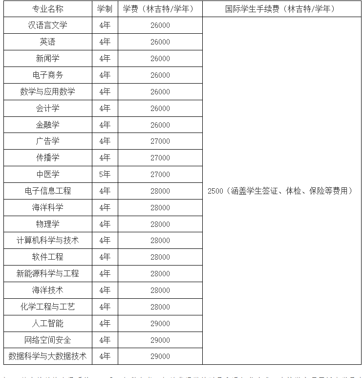 28000林吉特/学年专业:电子信息工程、海洋科学、物理学、计算机科学与技术、软件工程、新能源科学与工程、海洋技术、化学工程与工艺等专业,学费约为4.23万元/年。