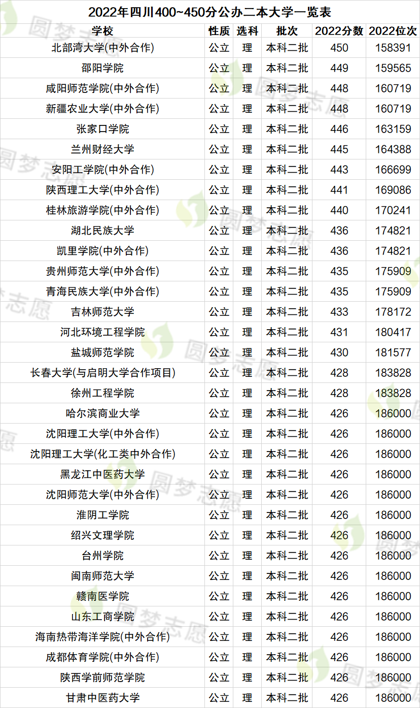 为大家整理了2022年所有在四川省招分400-450分的公办二本大学名单,供大家参考。