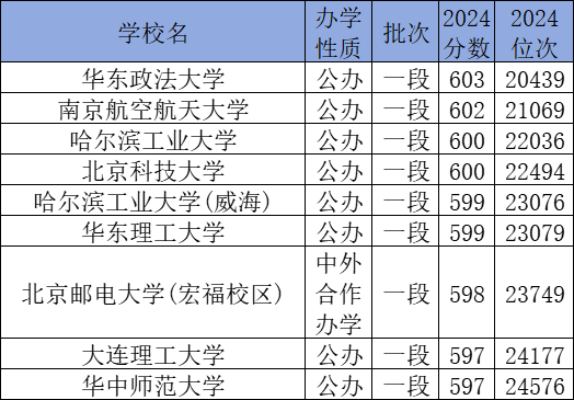2万~2.5万名范围内,最高位次院校为华东政法大学,2024年录取位次是20439名,录取分数线是603分;