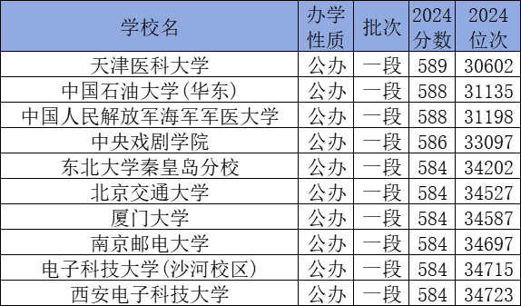3万~3.5万名范围内,最高位次院校为天津医科大学,2024年录取位次是30602名,录取分数线是589分;