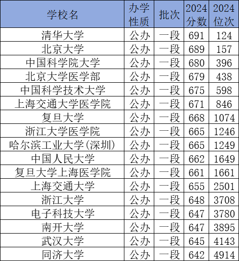 1-5000名范围内,最高位次院校为清华大学,2024年录取位次是124名,录取分数线是691分;