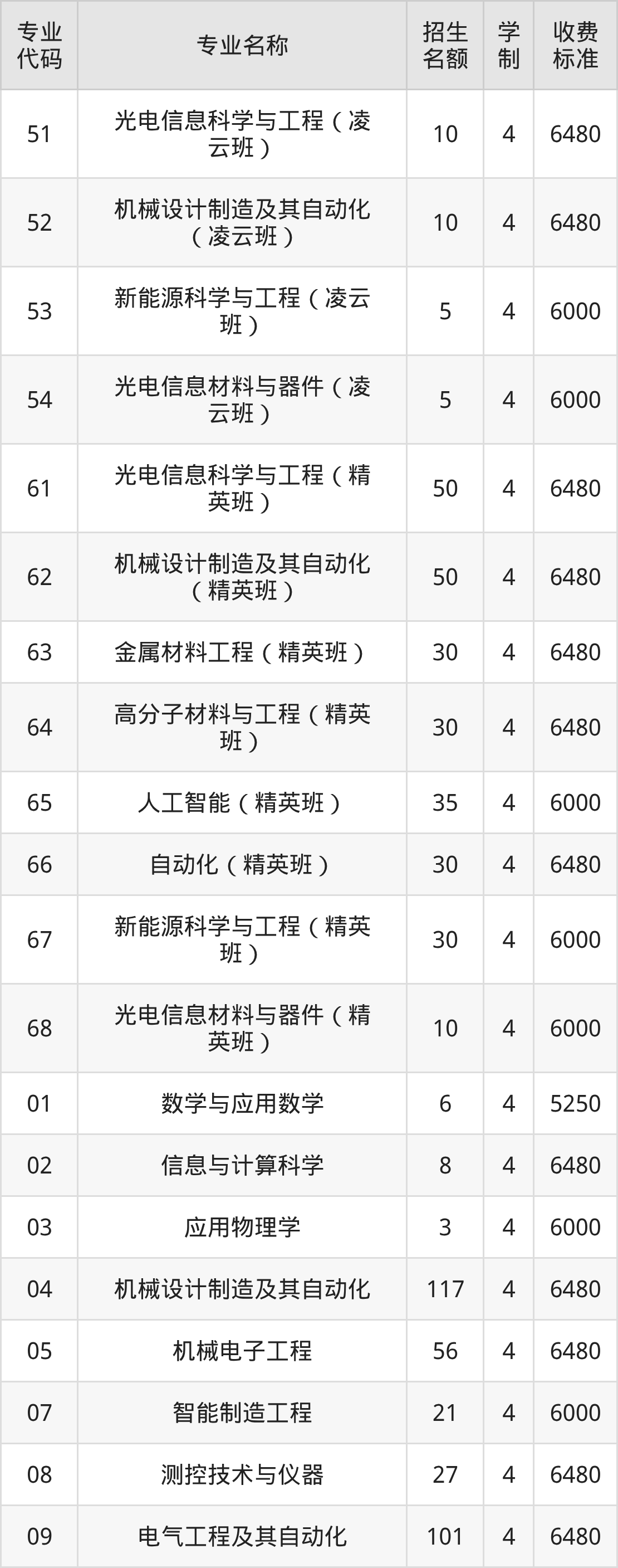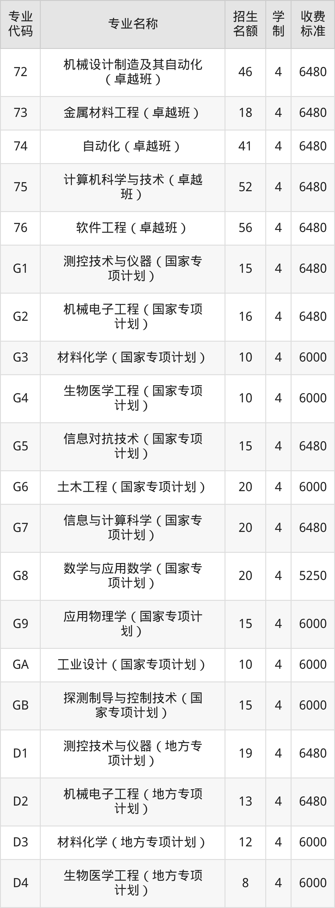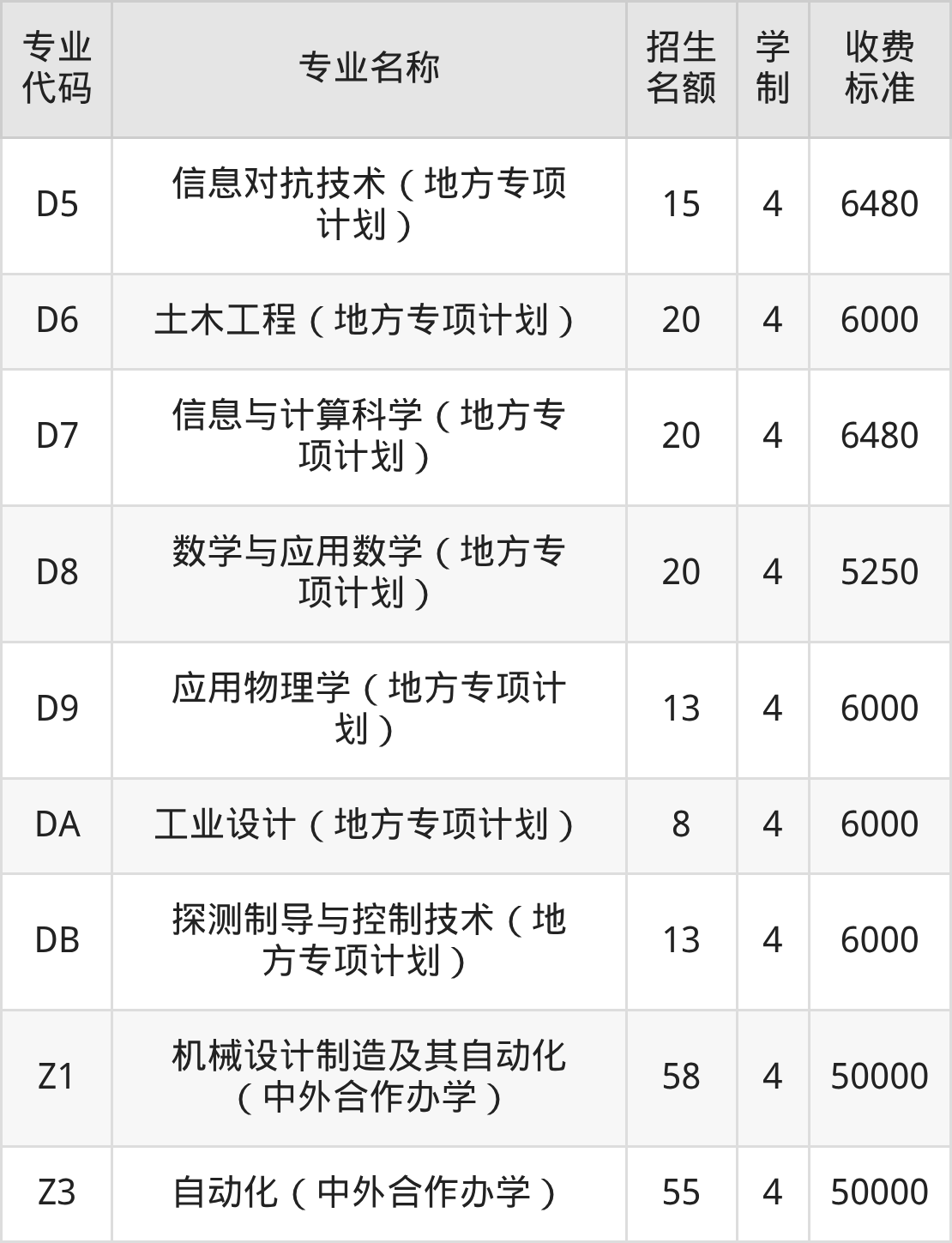 | 专业 代码 | 专业名称 | 招生 名额 | 学 制 | 收费 标准 |