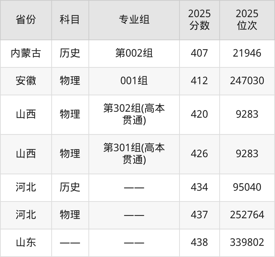 3+3地区:2025年山西职业技术学院录取最低分是438分(山东),对应的位次排名是339802名。