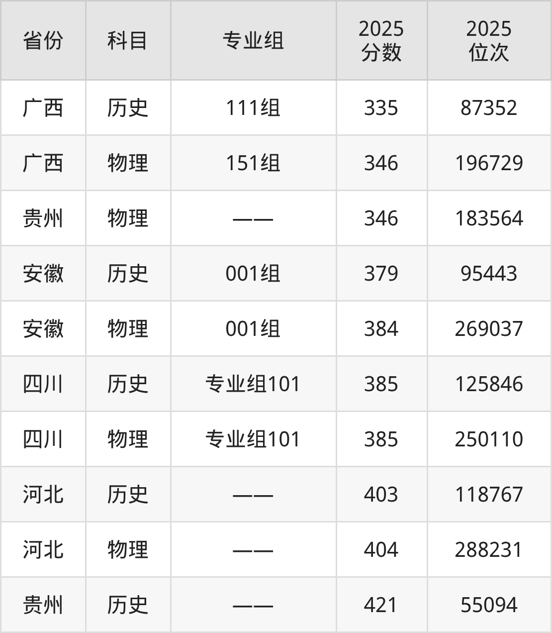 物理类:2025年安徽电子信息职业技术学院录取最低分是346分(广西),对应的位次排名是196729名。