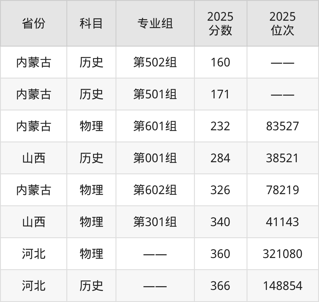物理类:2025年内蒙古能源职业学院录取最低分是340分(山西),对应的位次排名是41143名。