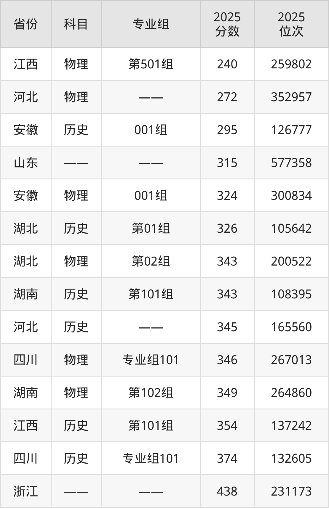 江西樟树中医药职业学院2025年录取分数线最低240分(位次259802)。本文将展示江西樟树中医药职业学院在各省最低录取分数线汇总,供2026届想要报考该校的考生查阅。