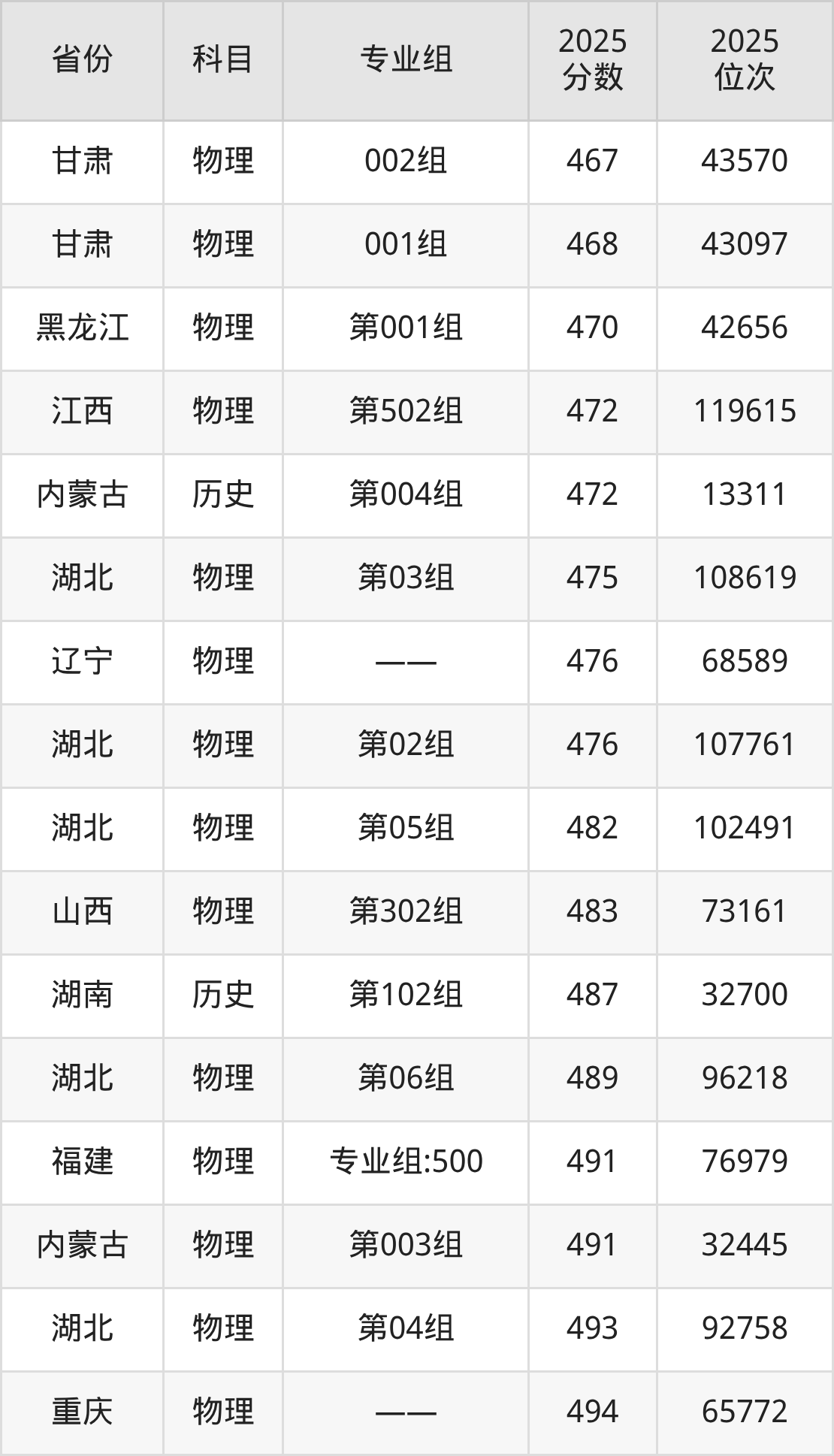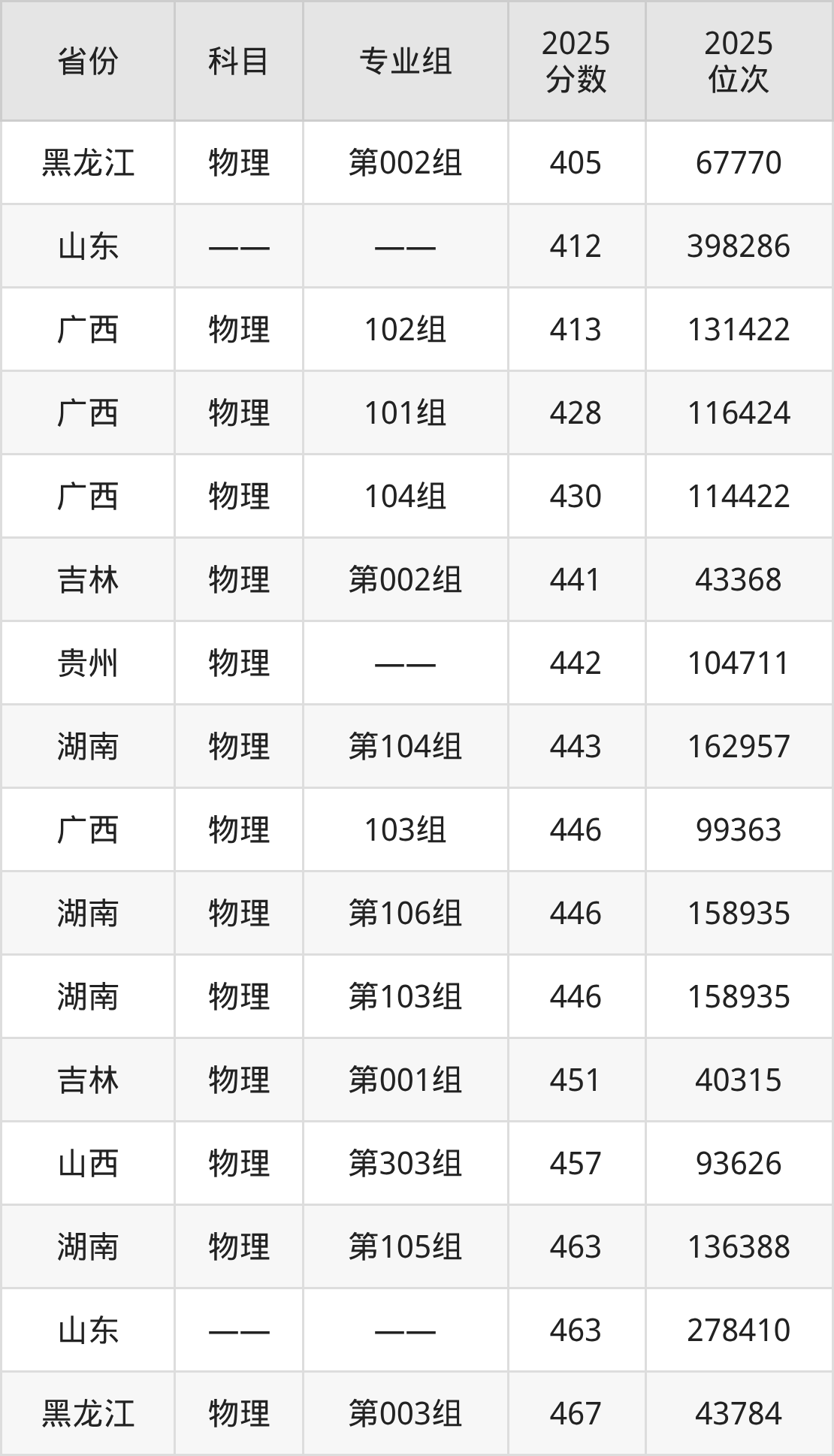 物理类:2025年泰山学院录取最低分是405分(黑龙江),对应的位次排名是67770名。