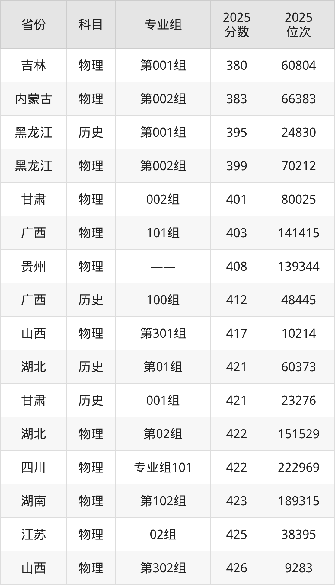 物理类:2025年湖南高速铁路职业技术学院录取最低分是380分(吉林),对应的位次排名是60804名。