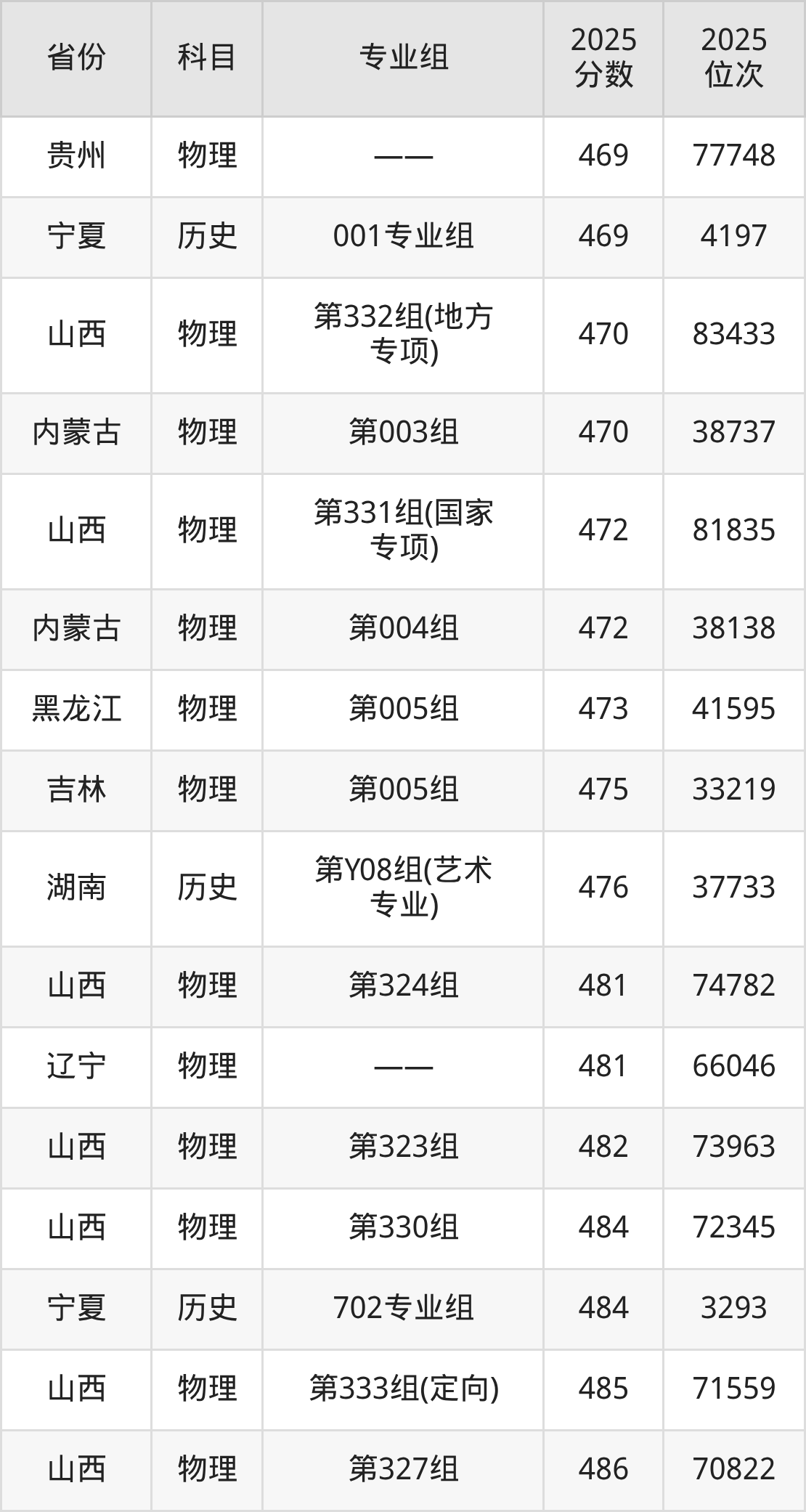物理类:2025年太原师范学院省内录取最低分是470分,对应的位次排名是83433名。建议:如果2026年排名超过83433名,那么被该校录取的概率较大。
