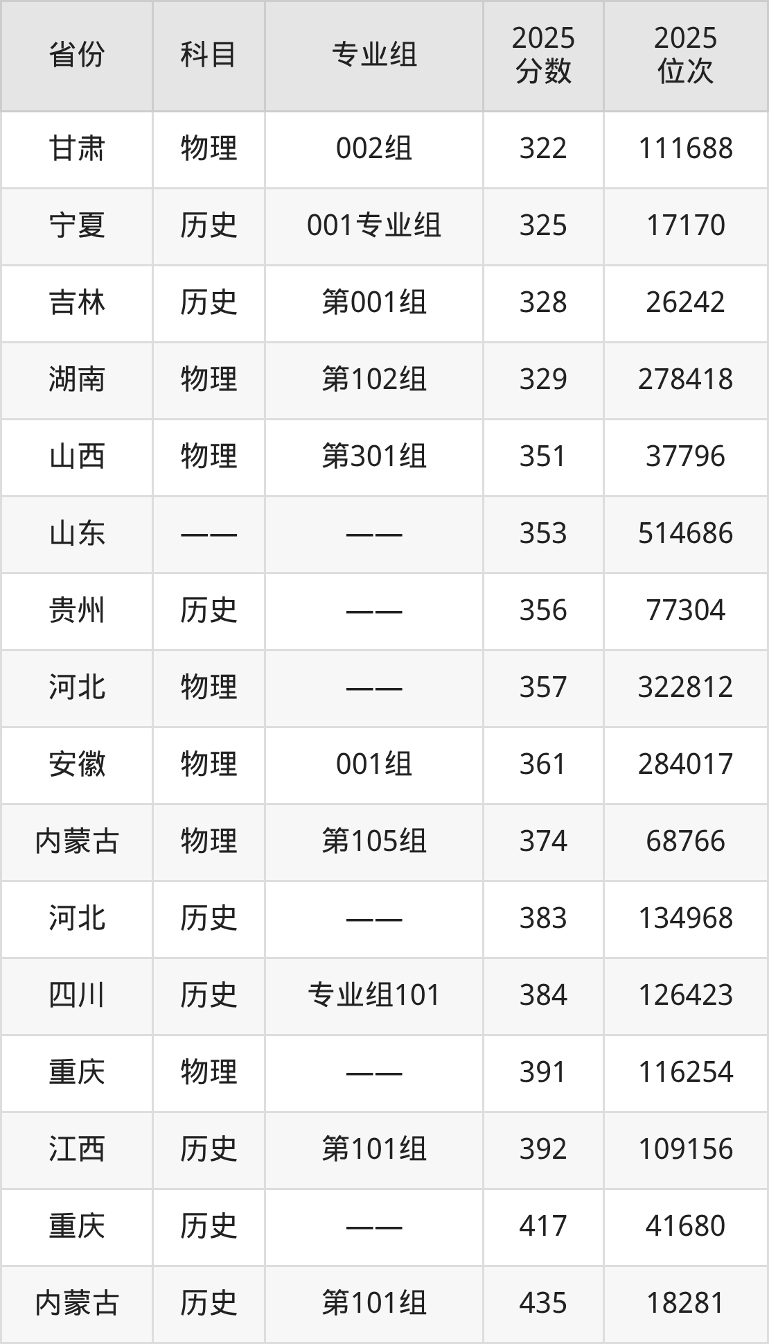 3+3地区:2025年商洛职业技术学院录取最低分是353分(山东),对应的位次排名是514686名。