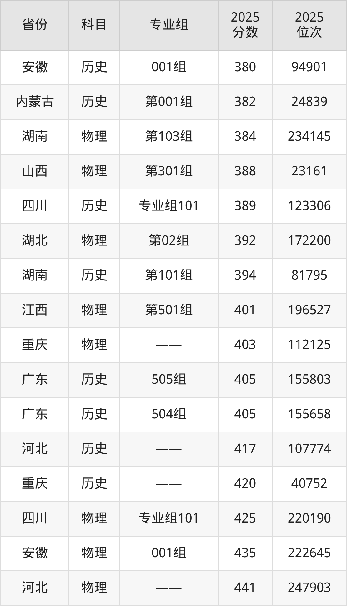 物理类:2025年湖南化工职业技术学院省内录取最低分是384分,对应的位次排名是234145名。建议:如果2026年排名超过234145名,那么被该校录取的概率较大。