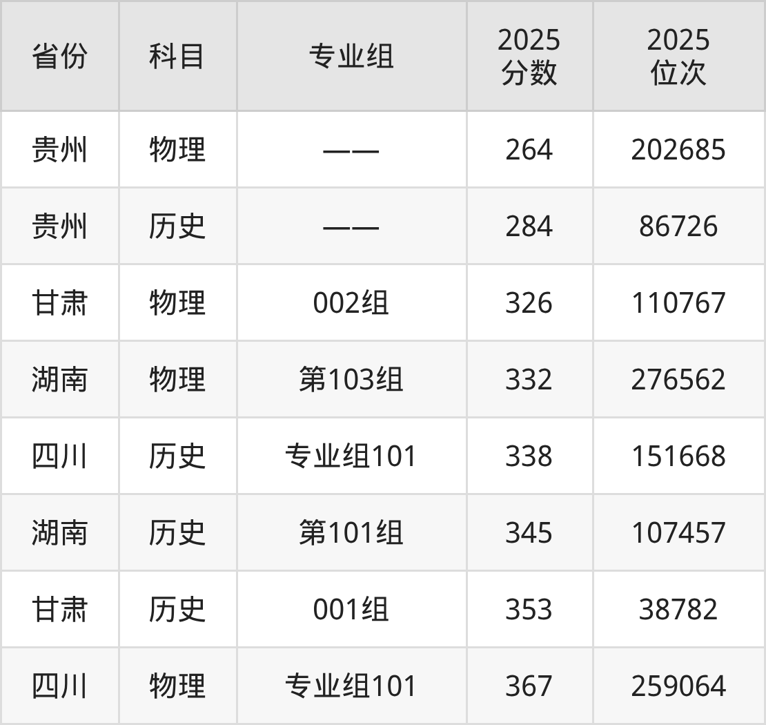 物理类:2025年益阳师范高等专科学校录取最低分是264分(贵州),对应的位次排名是202685名。