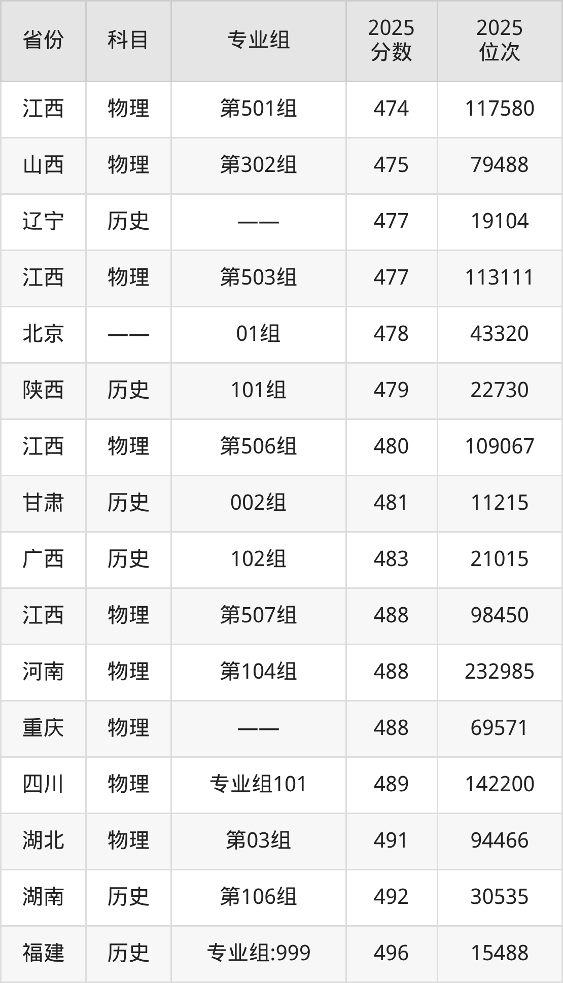 物理类:2025年九江学院省内录取最低分是443分,对应的位次排名是155943名。建议:如果2026年排名超过155943名,那么被该校录取的概率较大。