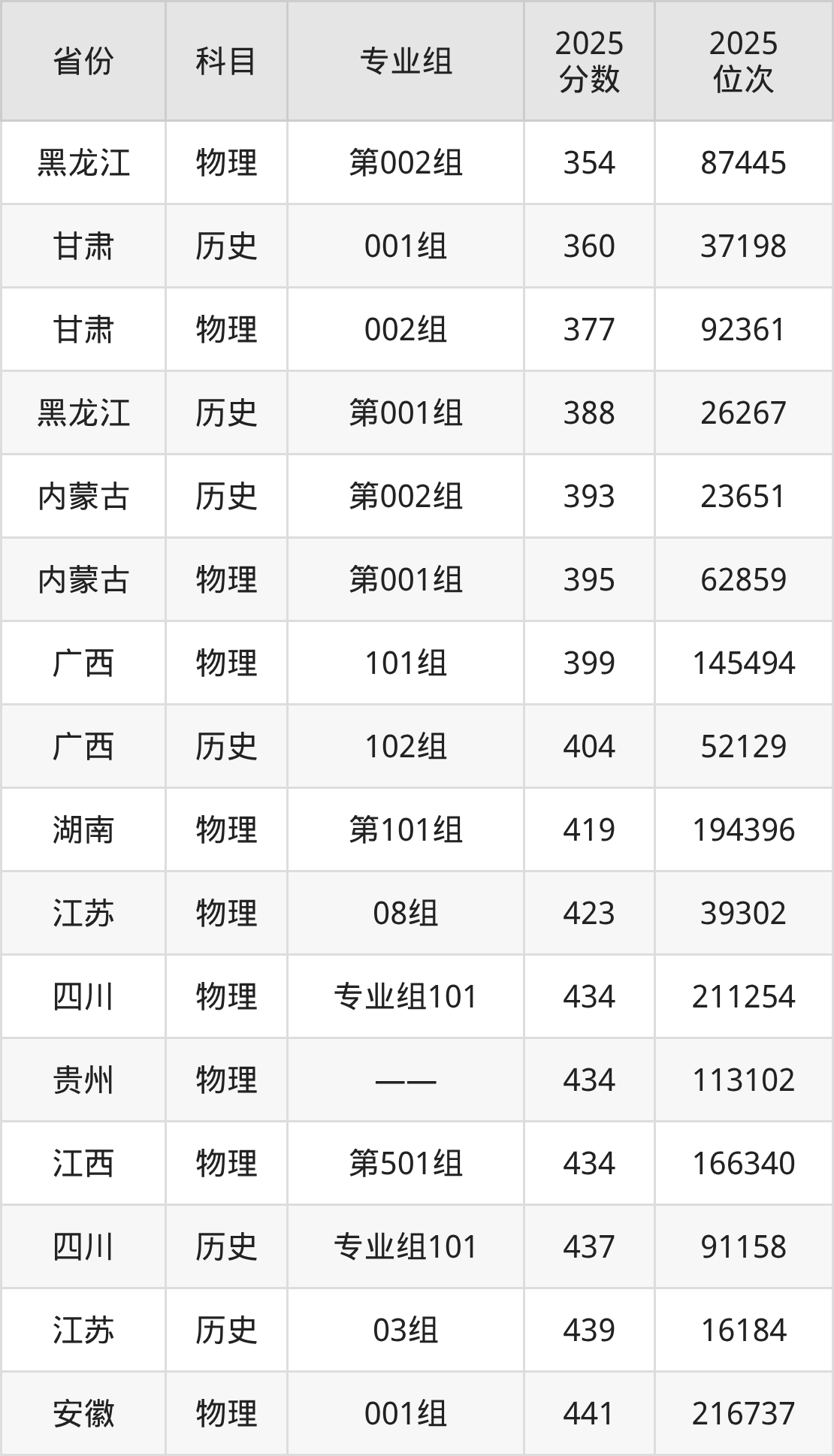 物理类:2025年扬州职业技术大学录取最低分是354分(黑龙江),对应的位次排名是87445名。