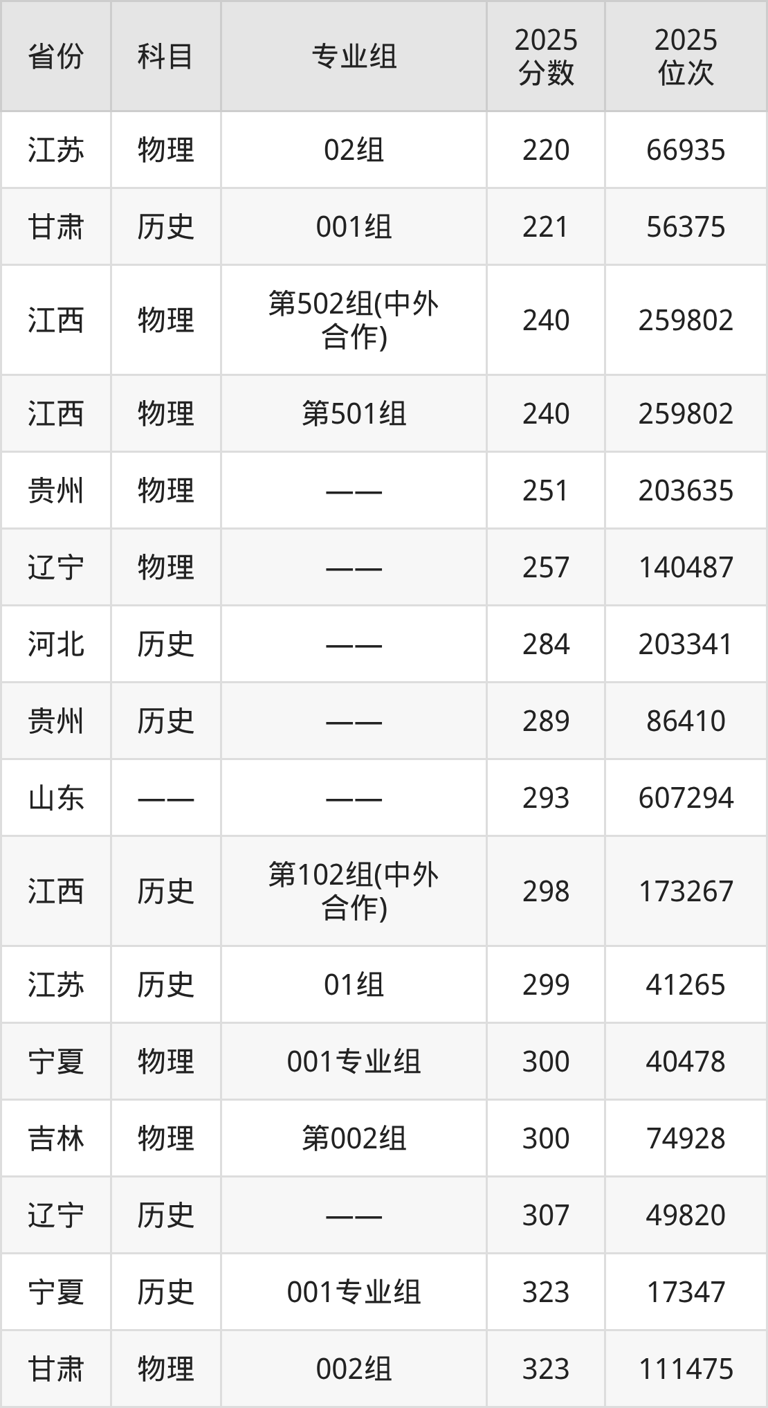 物理类:2025年吉安职业技术学院录取最低分是220分(江苏),对应的位次排名是66935名。