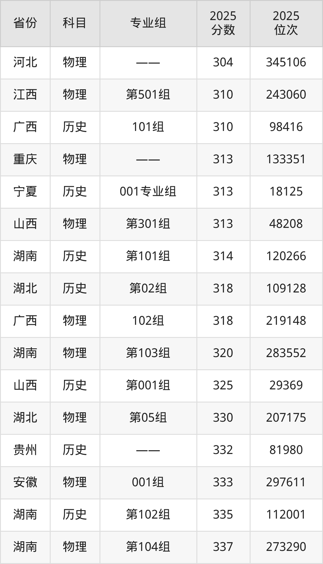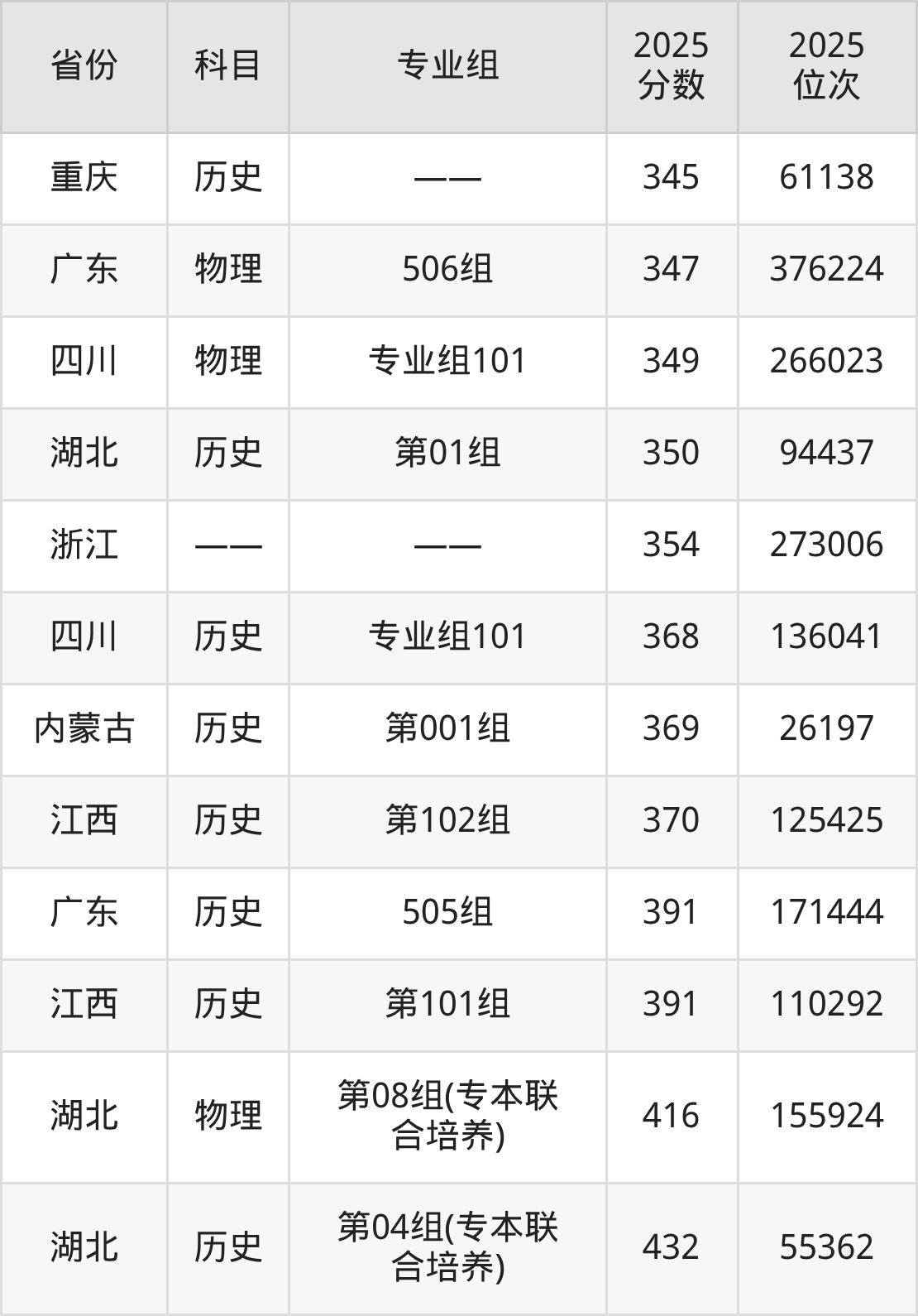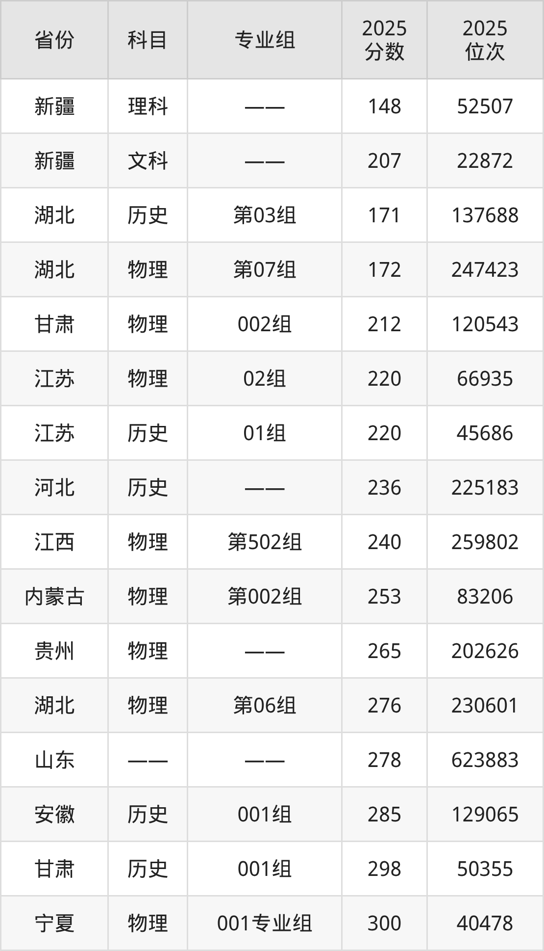 物理类:2025年武汉商贸职业学院录取最低分是212分(甘肃),对应的位次排名是120543名。