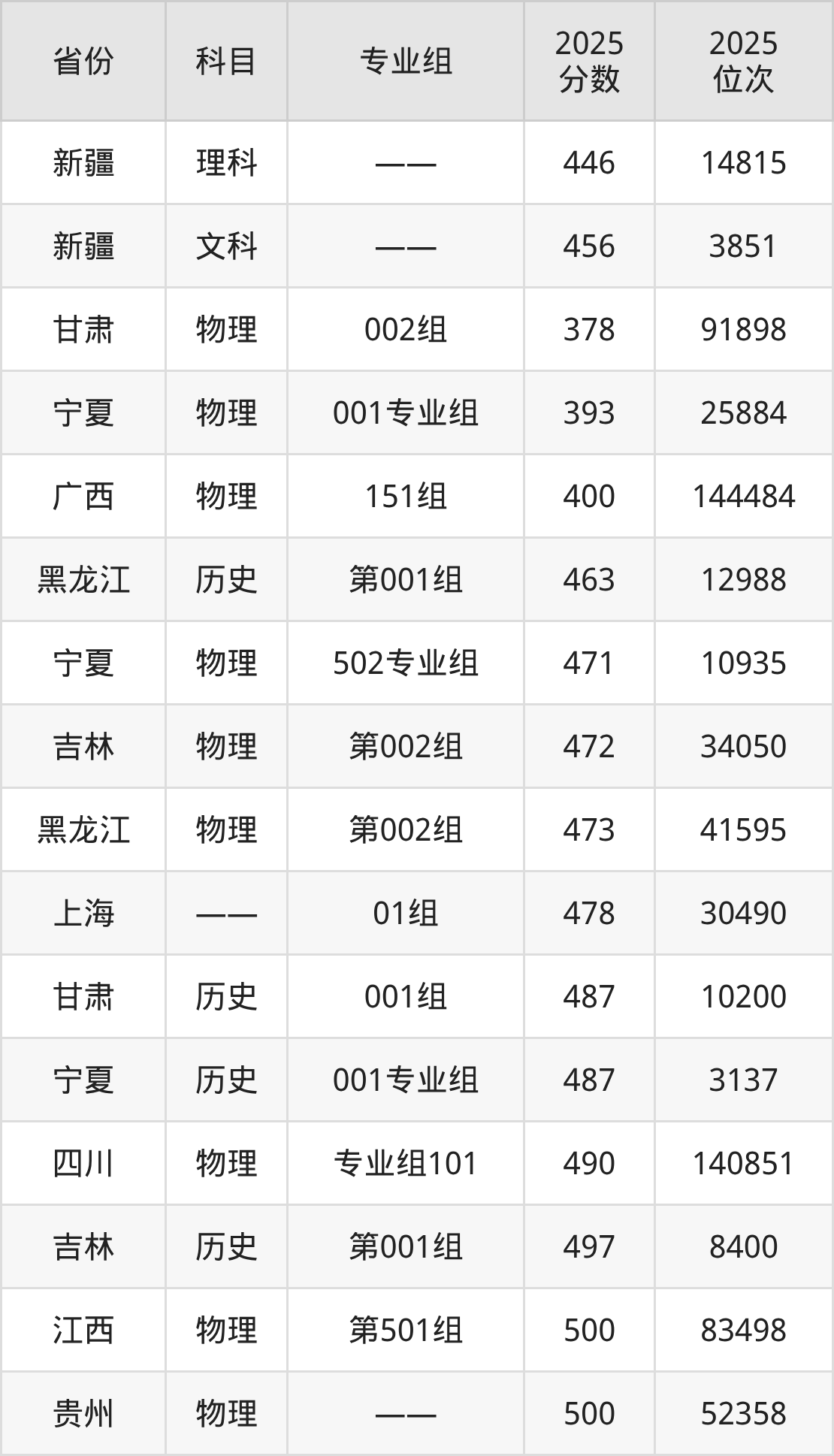 理科:2025年安徽财经大学录取最低分是446分(新疆),对应的位次排名是14815名。