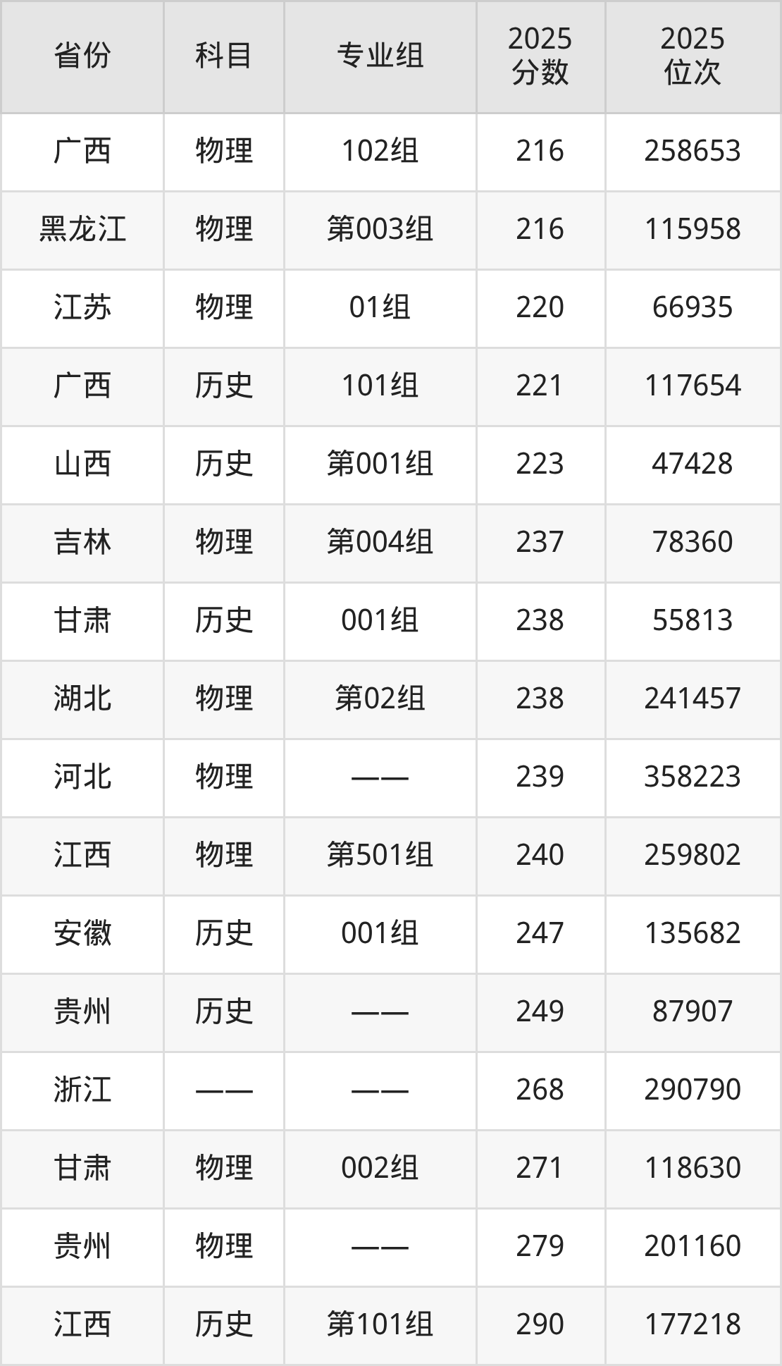 物理类:2025年四川国际标榜职业学院录取最低分是166分(辽宁),对应的位次排名是143326名。