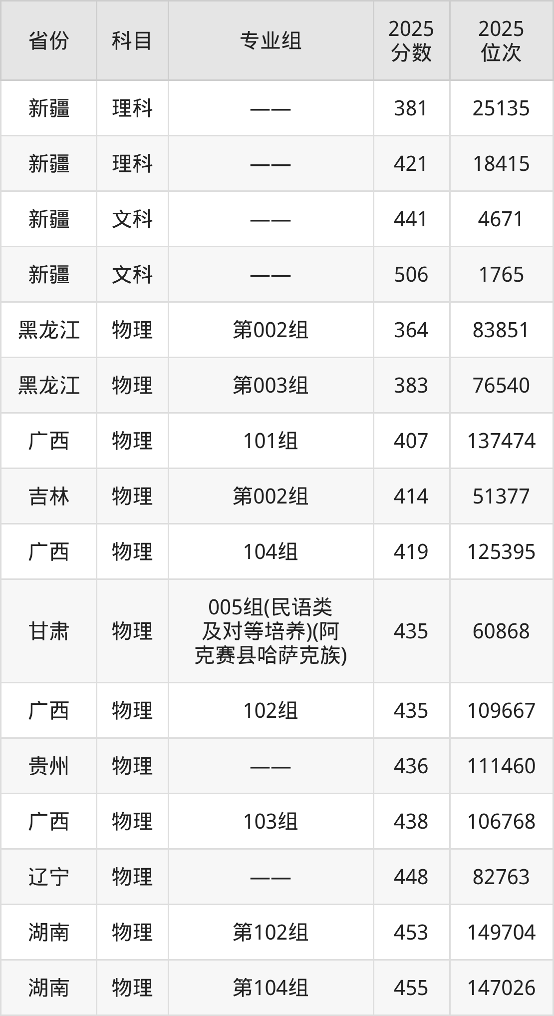 2025年新疆医科大学全国排名第225位,2025年录取分数线最低364分(位次83851)。本文将展示新疆医科大学在各省最低录取分数线汇总,供2026届想要报考该校的考生查阅。