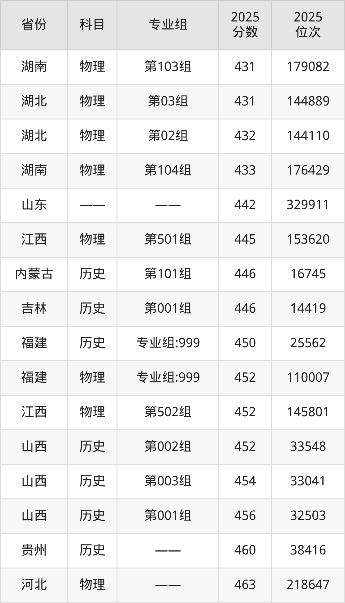 3+3地区:2025年桂林学院录取最低分是442分(山东),对应的位次排名是329911名。