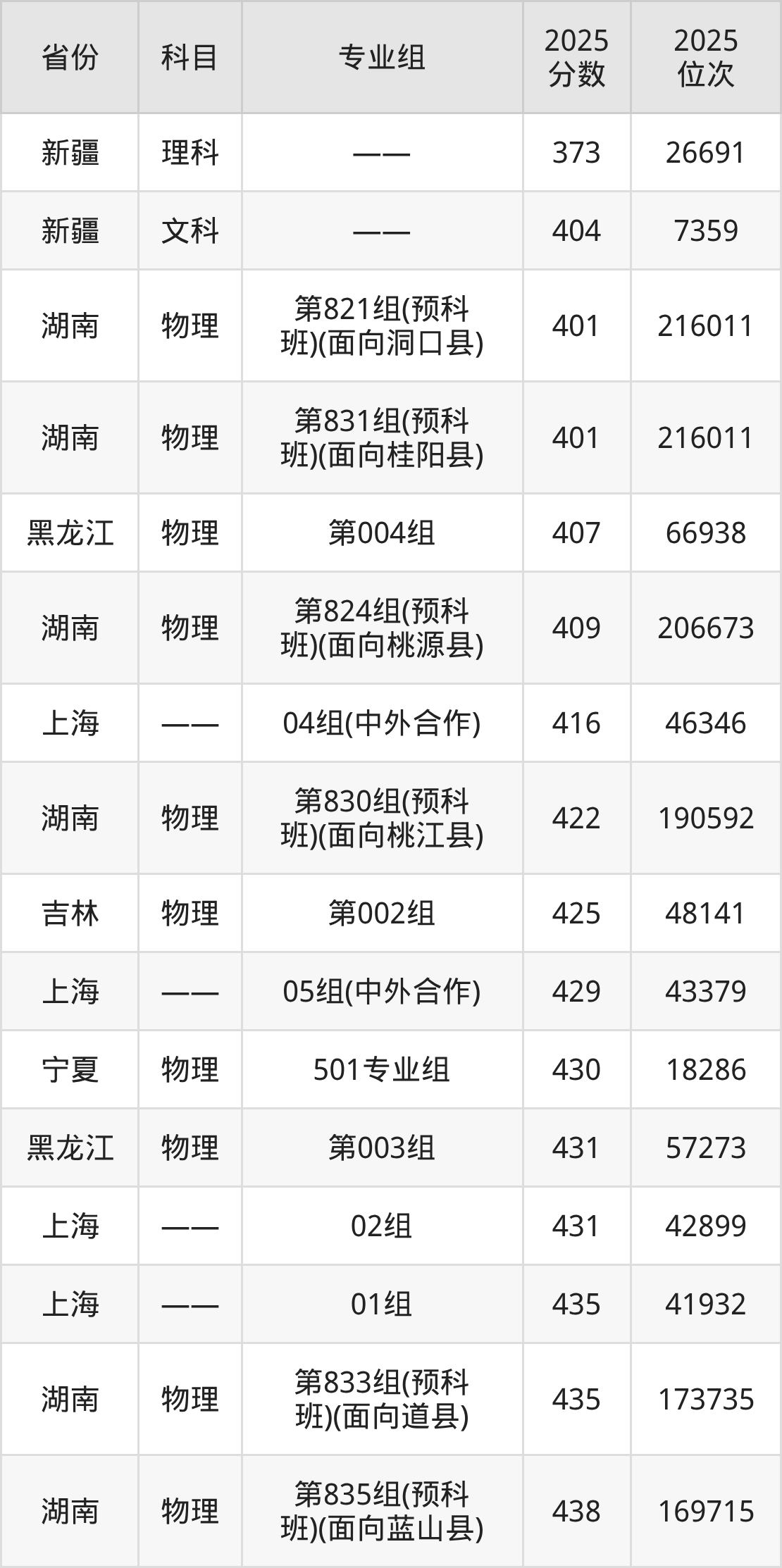 文科:2025年湖南文理学院录取最低分是404分(新疆),对应的位次排名是7359名。