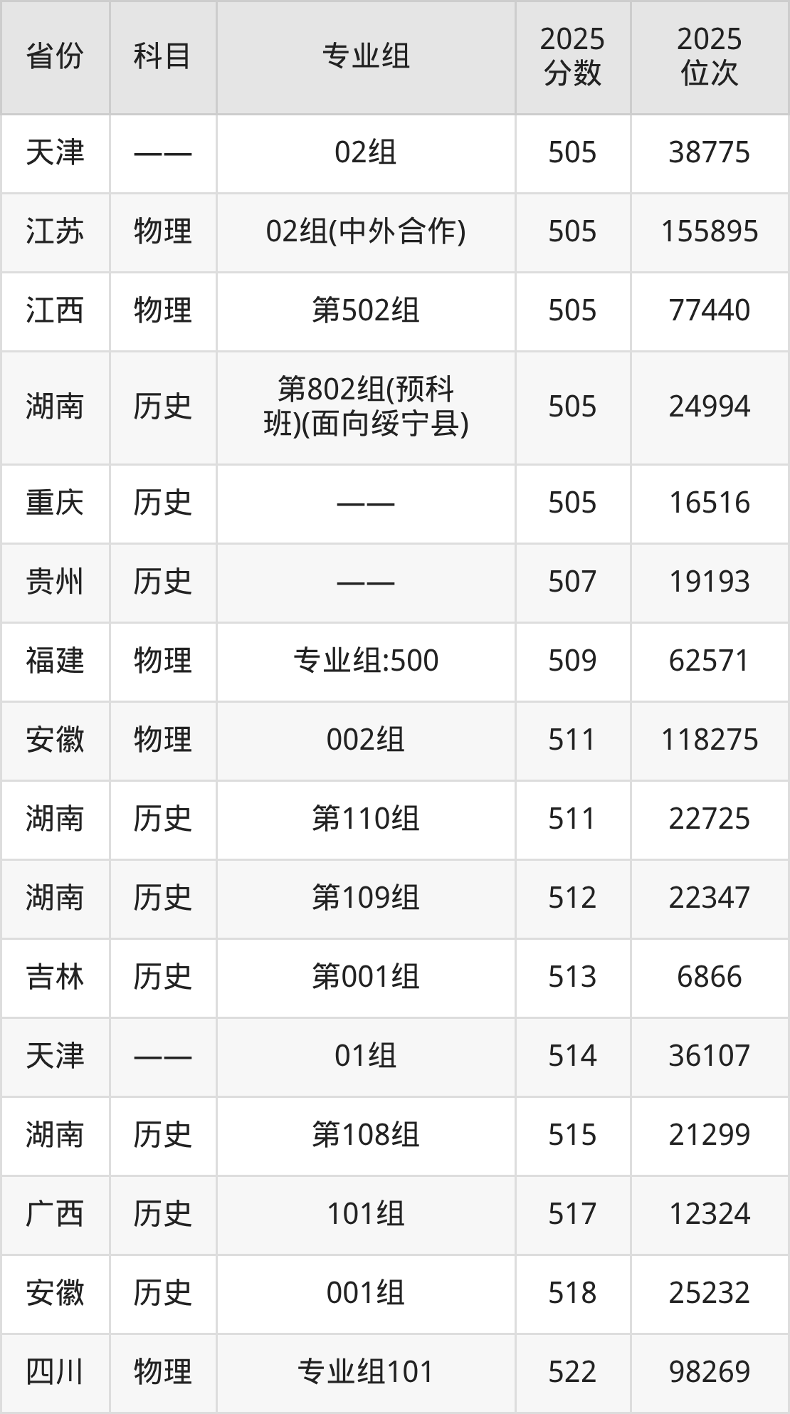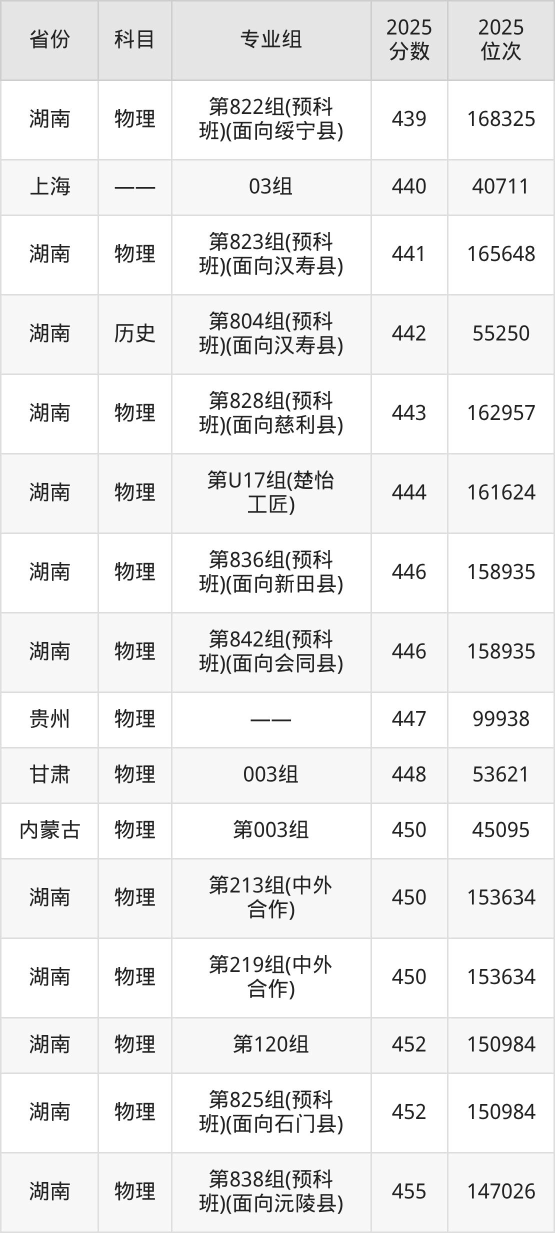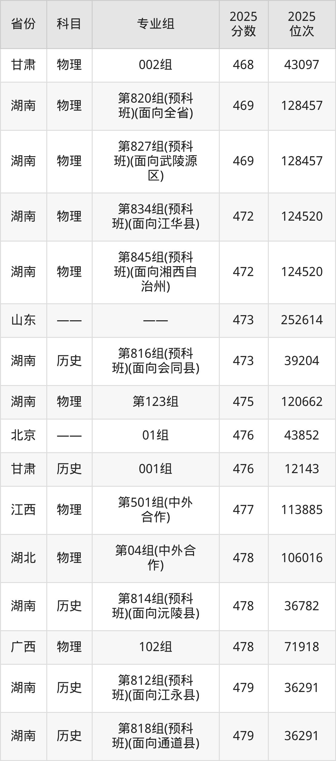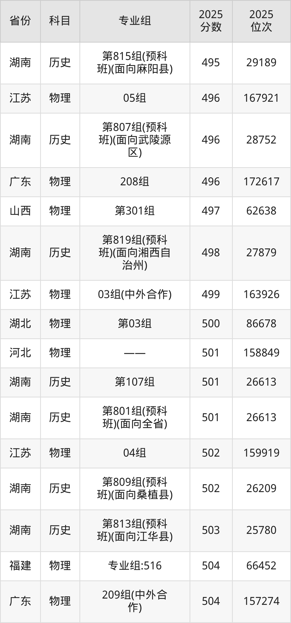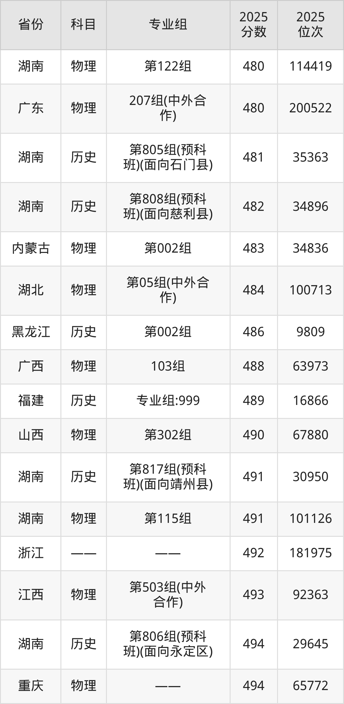 物理类:2025年湖南文理学院省内录取最低分是401分,对应的位次排名是216011名。建议:如果2026年排名超过216011名,那么被该校录取的概率较大。