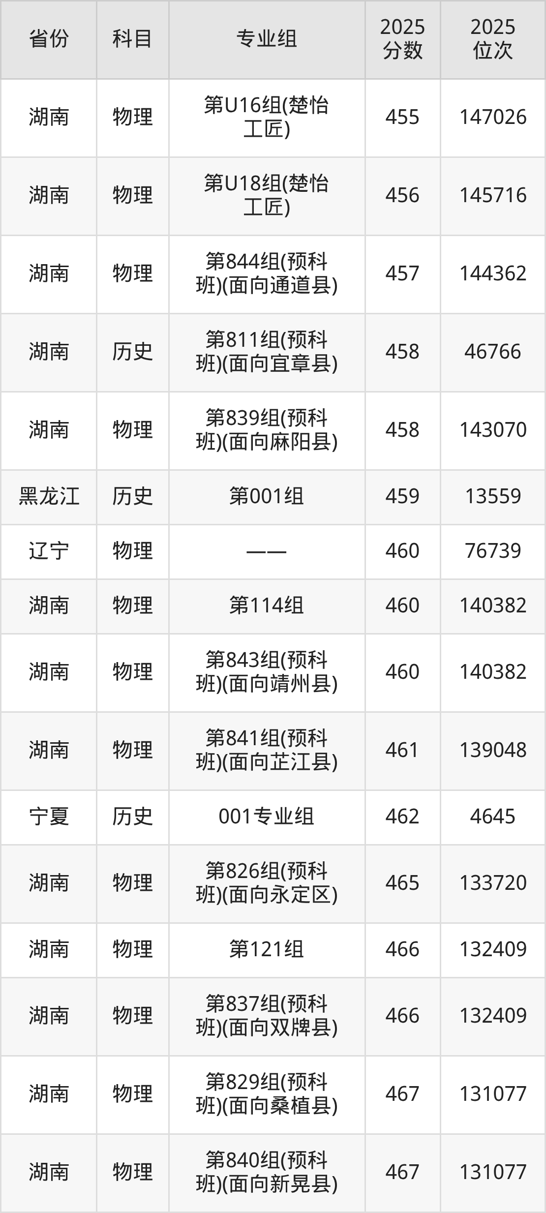 历史类:2025年湖南文理学院录取最低分是459分(黑龙江),对应的位次排名是13559名。