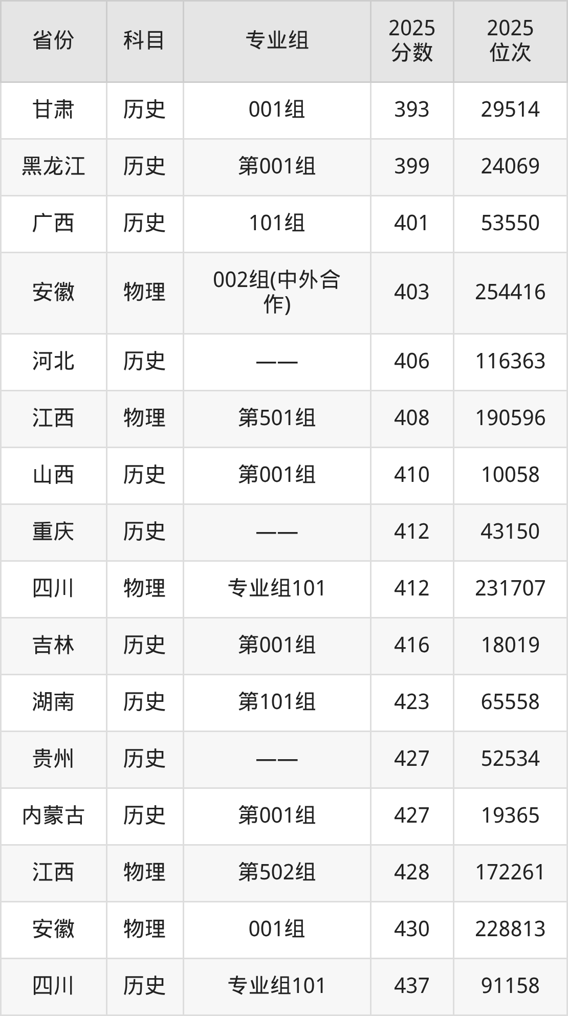 历史类:2025年承德护理职业学院录取最低分是250分(安徽),对应的位次排名是135315名。