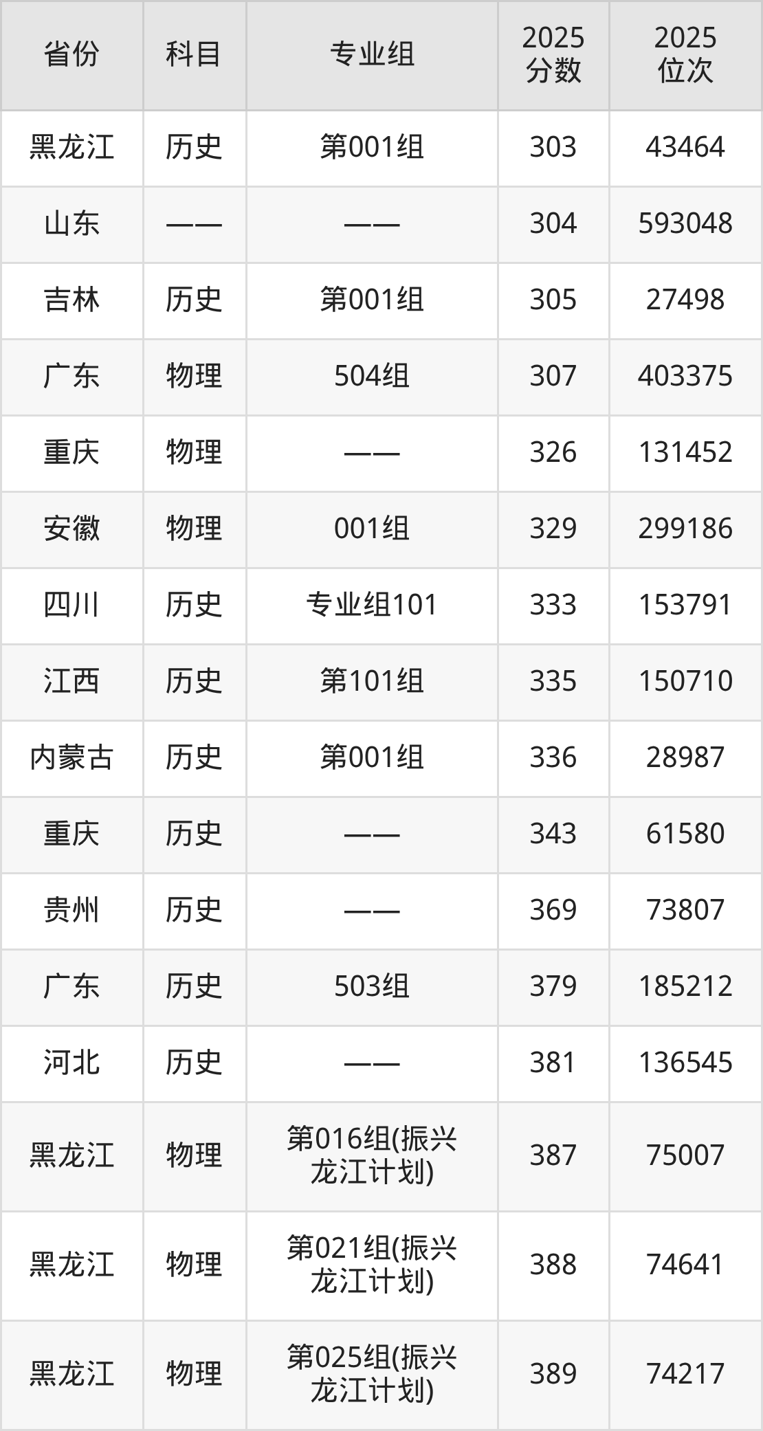 历史类:2025年黑龙江生态工程职业学院省内录取最低分是303分,对应的位次排名是43464名。建议:如果2026年排名超过43464名,那么被该校录取的概率较大。