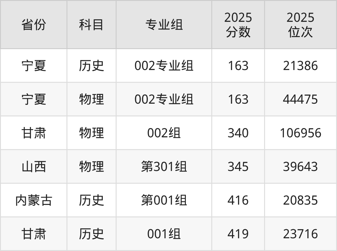 物理类:2025年宁夏财经职业技术学院录取最低分是340分(甘肃),对应的位次排名是106956名。