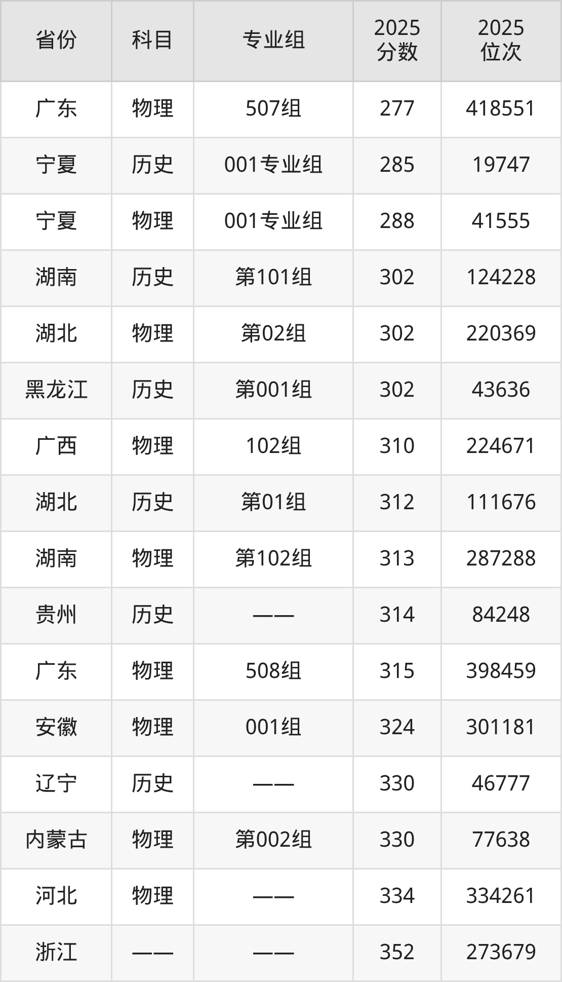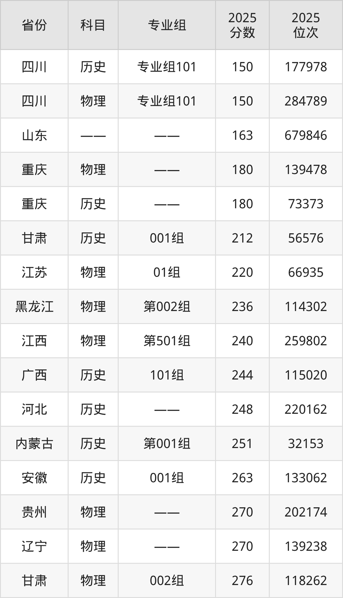 历史类:2025年泸州医疗器械职业学院省内录取最低分是150分,对应的位次排名是177978名。建议:如果2026年排名超过177978名,那么被该校录取的概率较大。