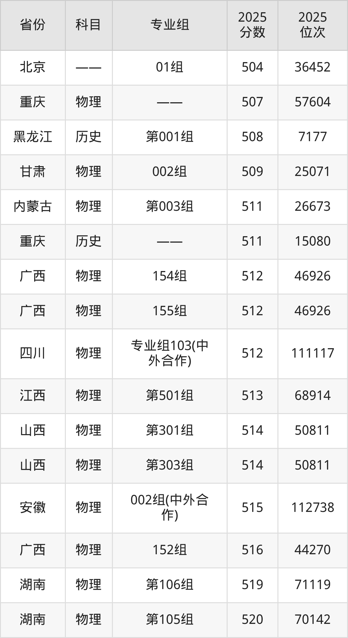 物理类:2025年重庆科技大学市内录取最低分是507分,对应的位次排名是57604名。建议:如果2026年排名超过57604名,那么被该校录取的概率较大。