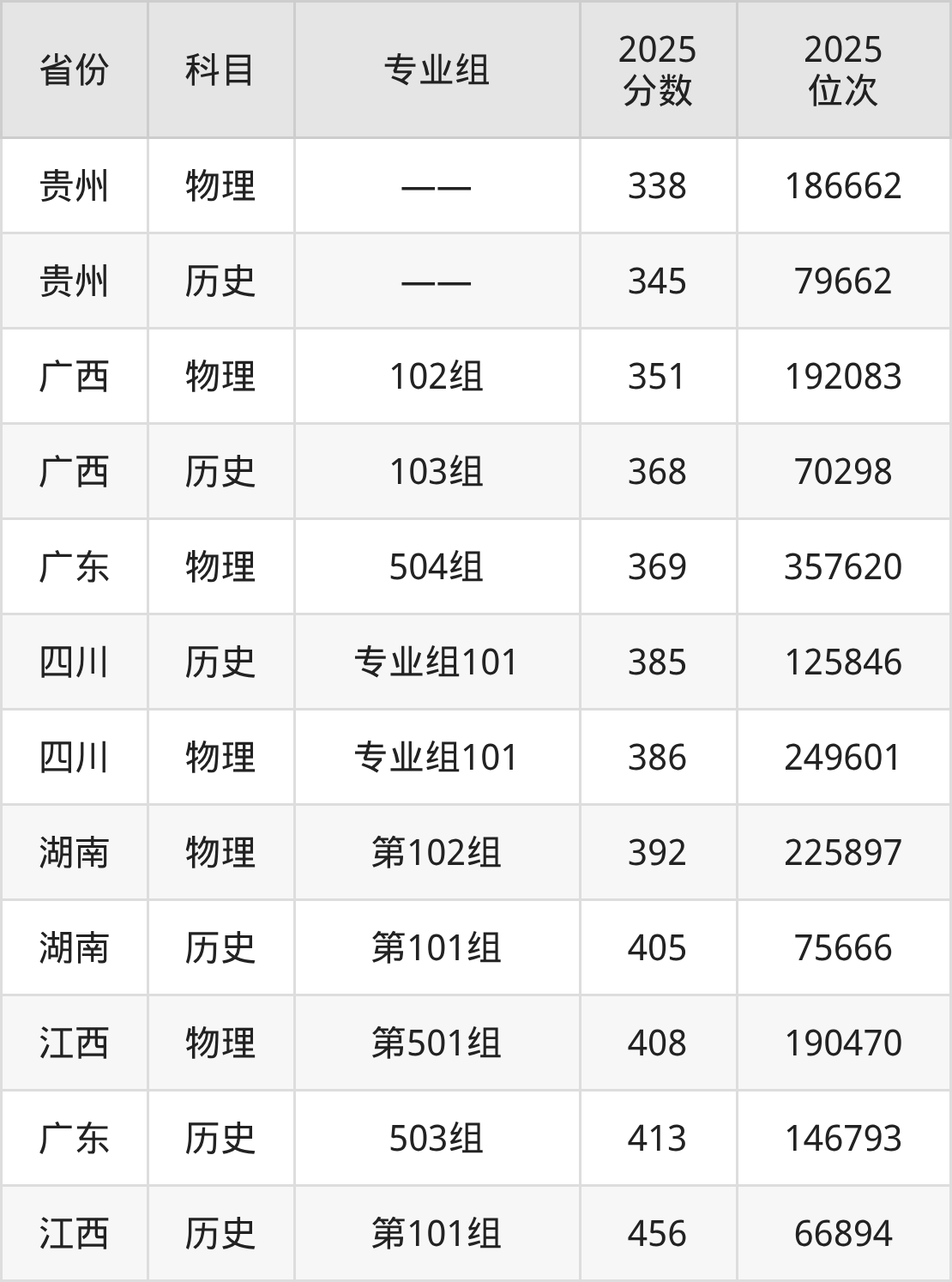 物理类:2025年湖南网络工程职业学院录取最低分是338分(贵州),对应的位次排名是186662名。