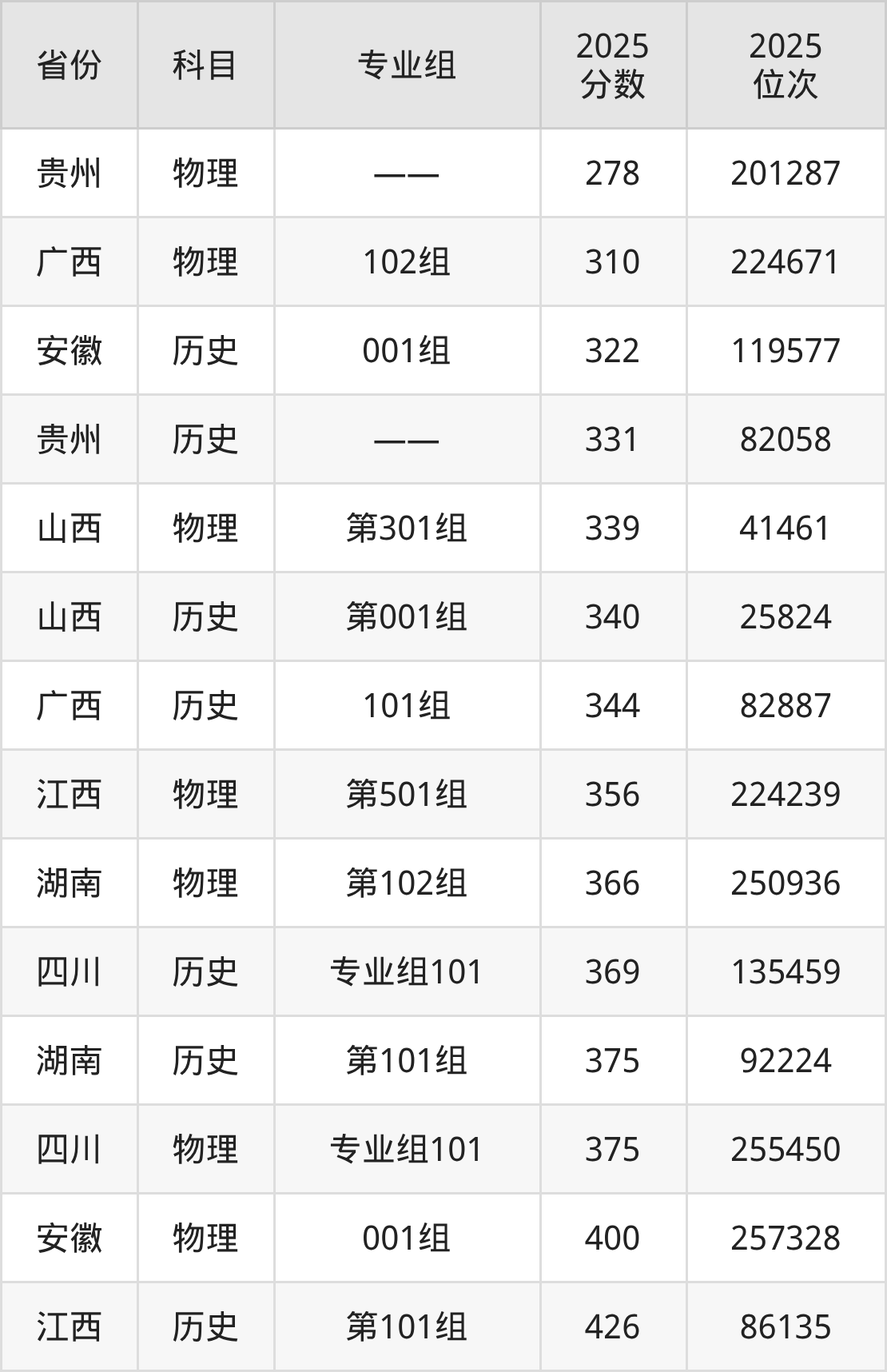 历史类:2025年湖南劳动人事职业学院录取最低分是322分(安徽),对应的位次排名是119577名。