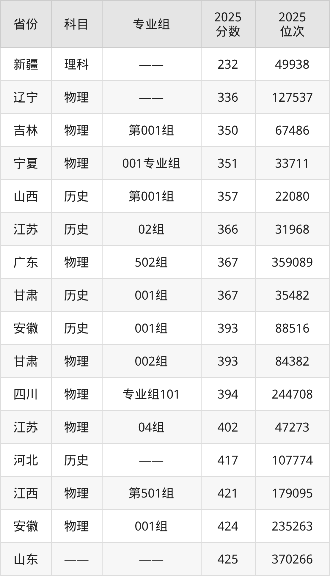 3+3地区:2025年扬州工业职业技术学院录取最低分是425分(山东),对应的位次排名是370266名。