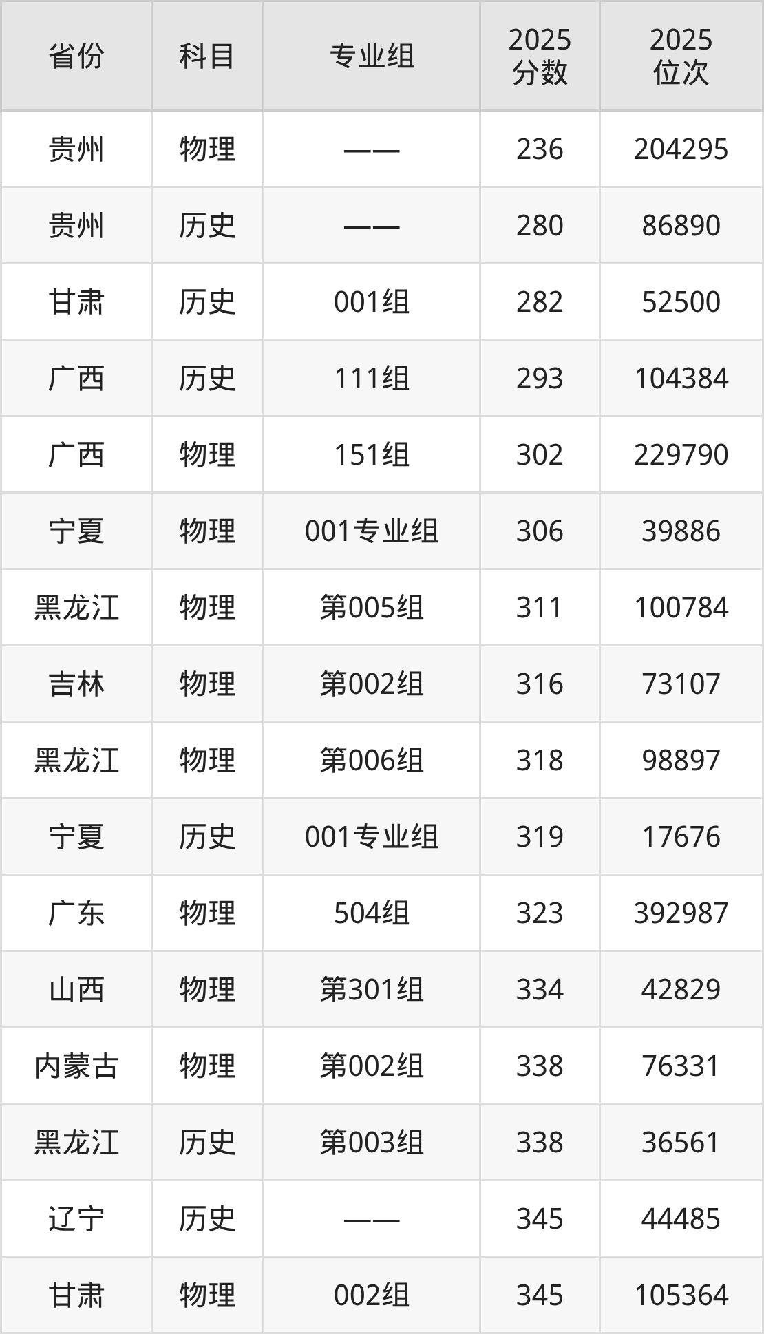 物理类:2025年黑龙江职业学院录取最低分是236分(贵州),对应的位次排名是204295名。