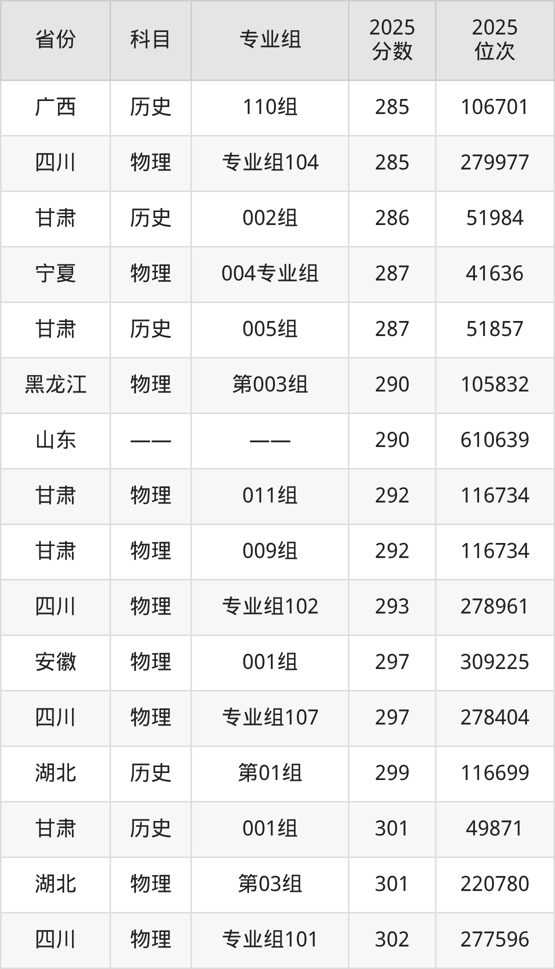 3+3地区:2025年喀什理工职业技术学院录取最低分是290分(山东),对应的位次排名是610639名。