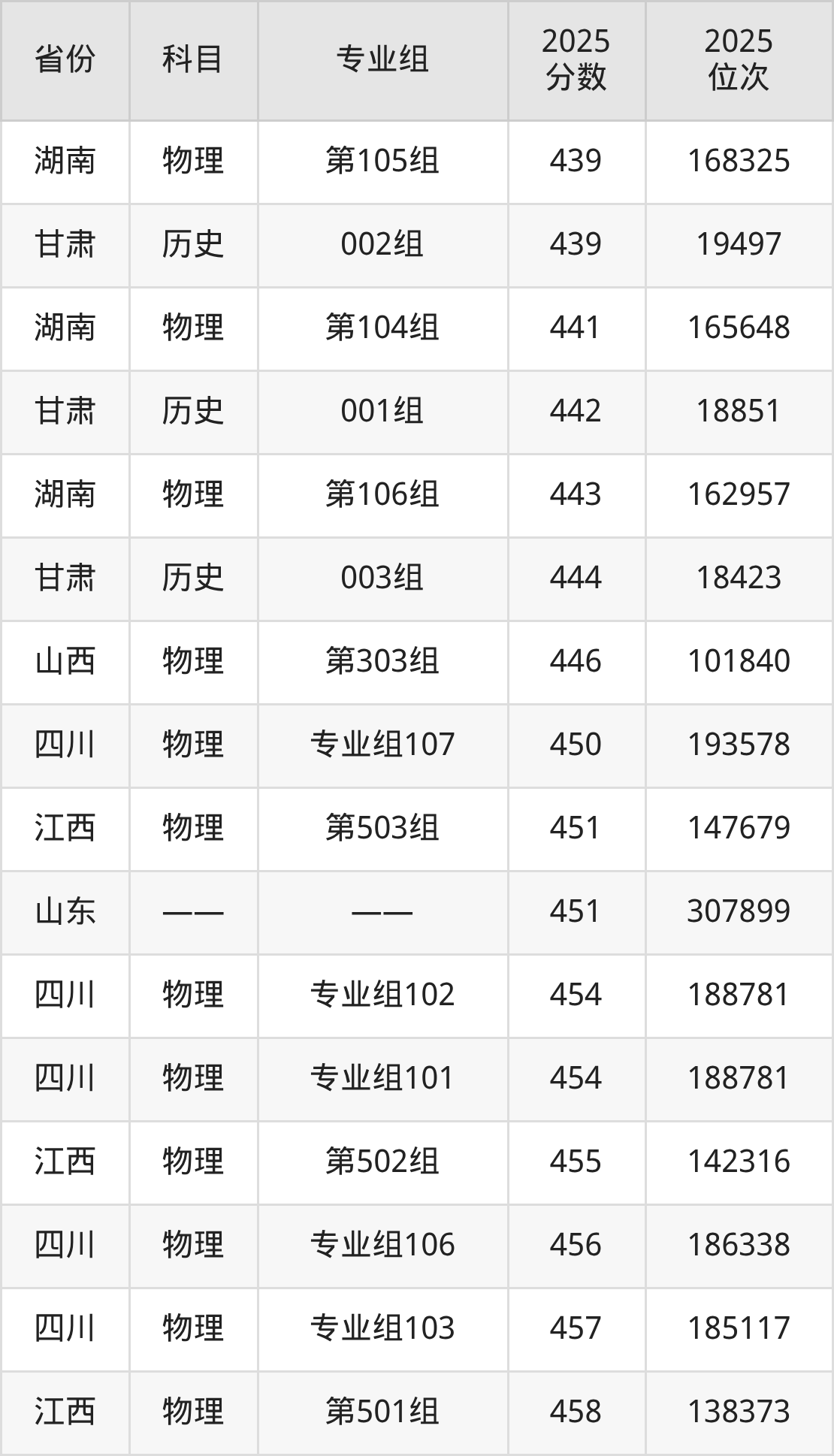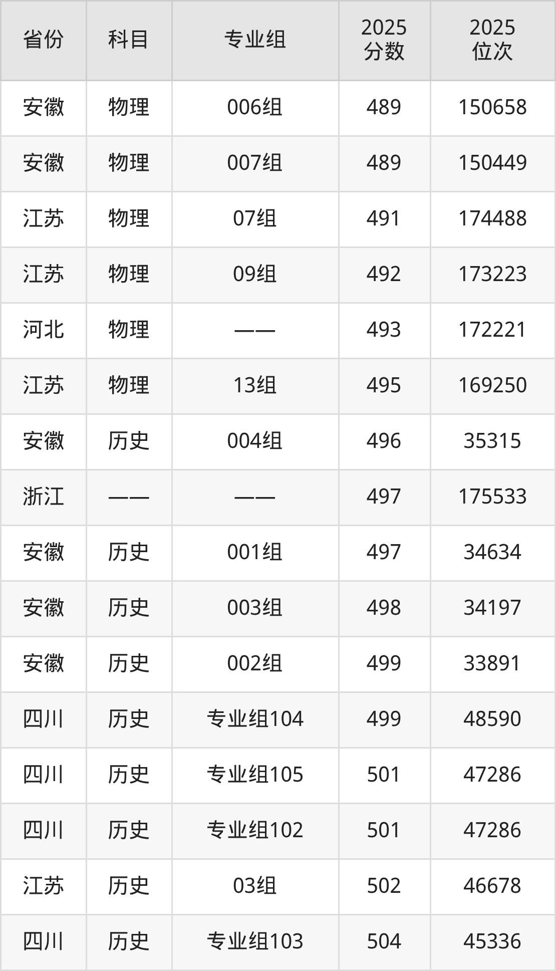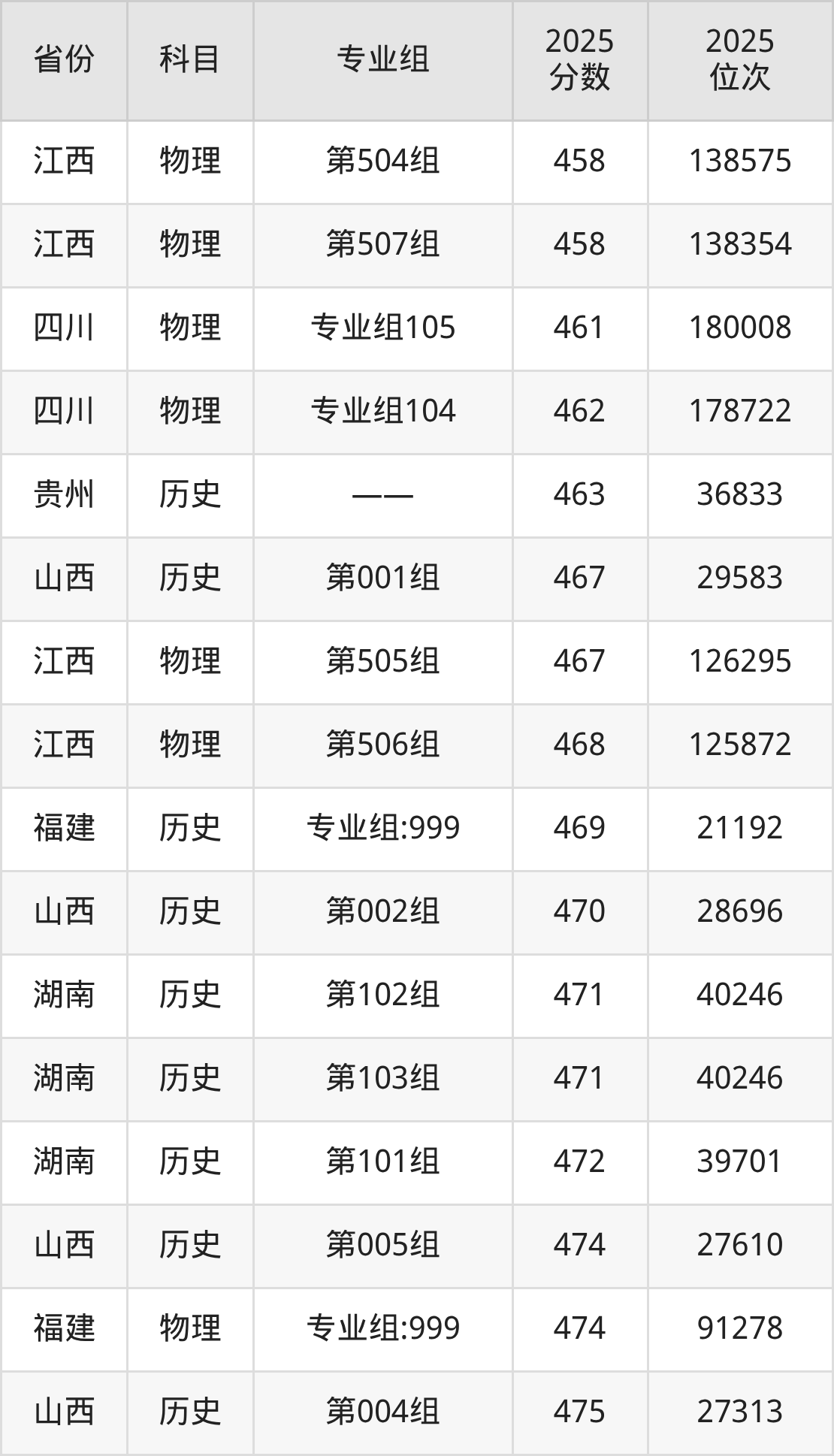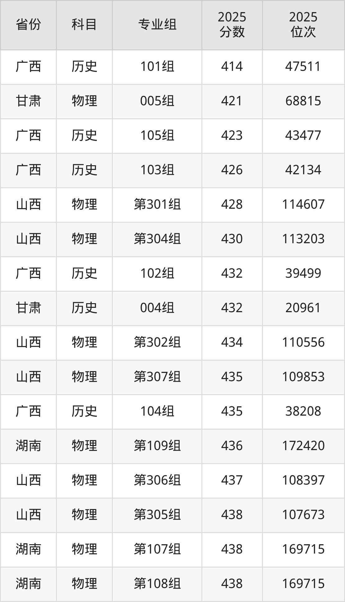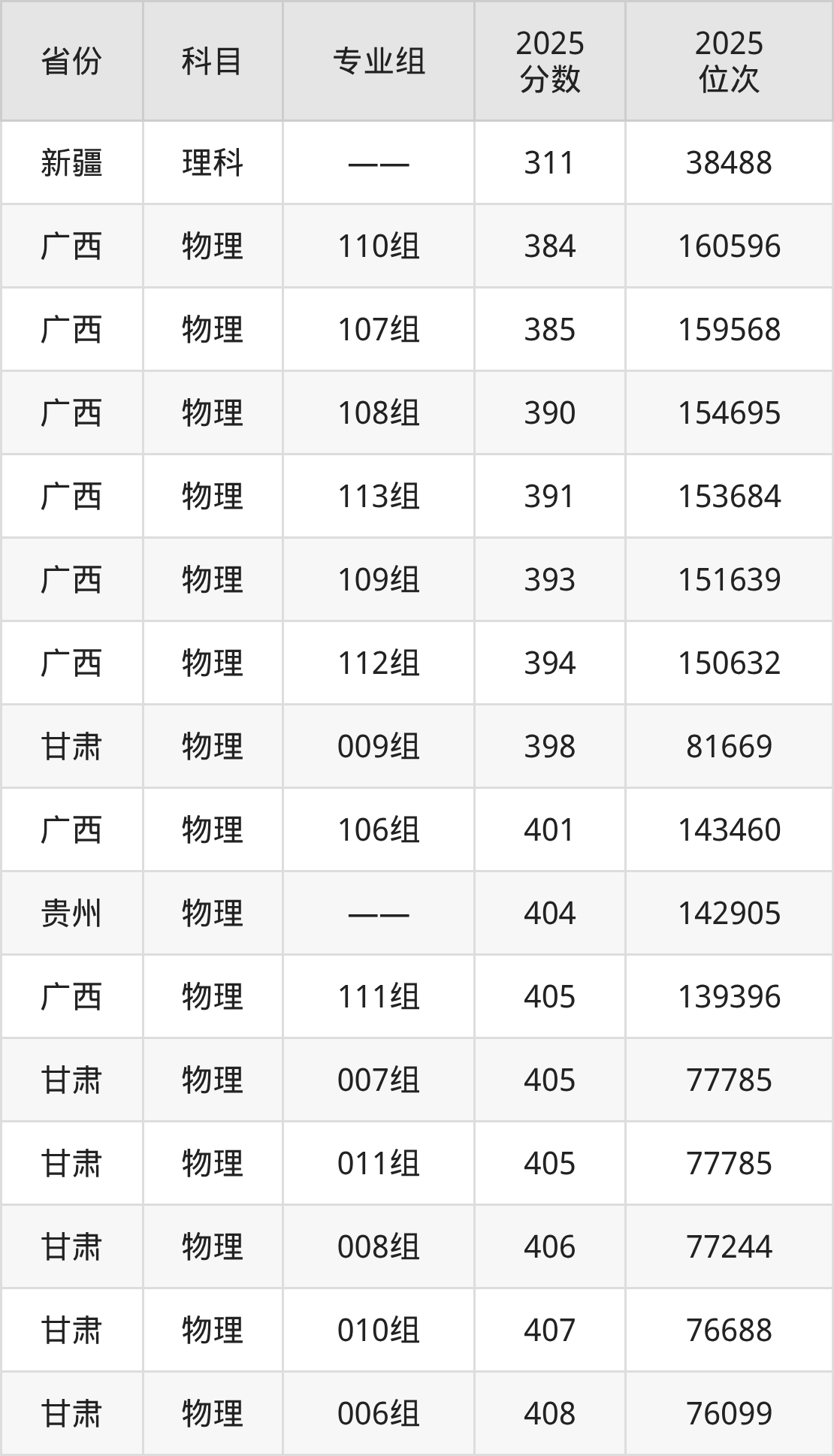 物理类:2025年江苏师范大学科文学院录取最低分是384分(广西),对应的位次排名是160596名。