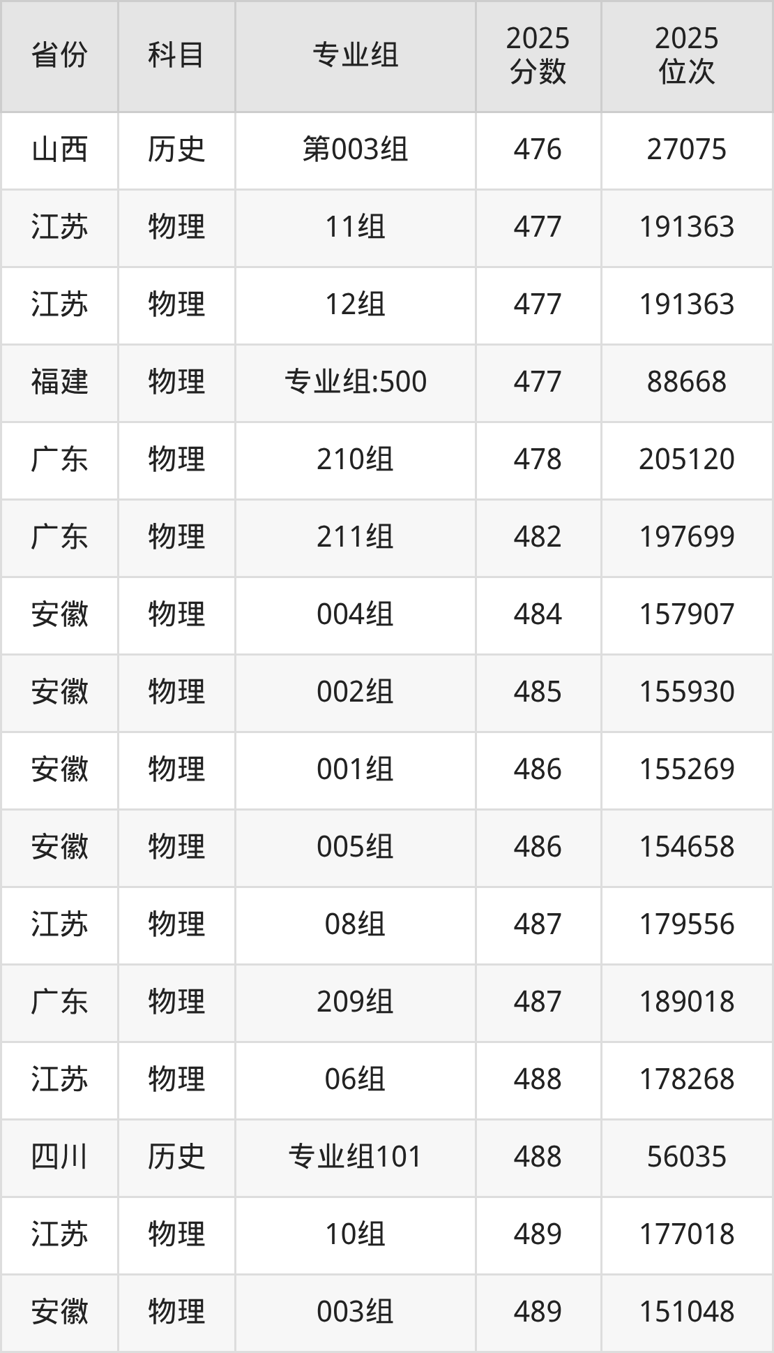 物理类:2025年江苏师范大学科文学院省内录取最低分是477分,对应的位次排名是191363名。建议:如果2026年排名超过191363名,那么被该校录取的概率较大。