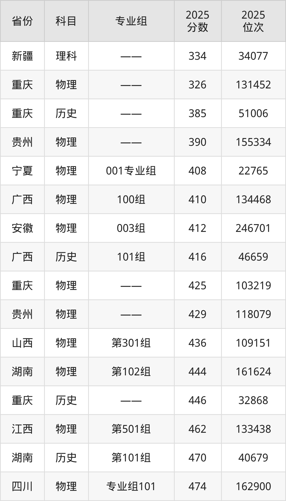 理科:2025年重庆机电职业技术大学录取最低分是334分(新疆),对应的位次排名是34077名。