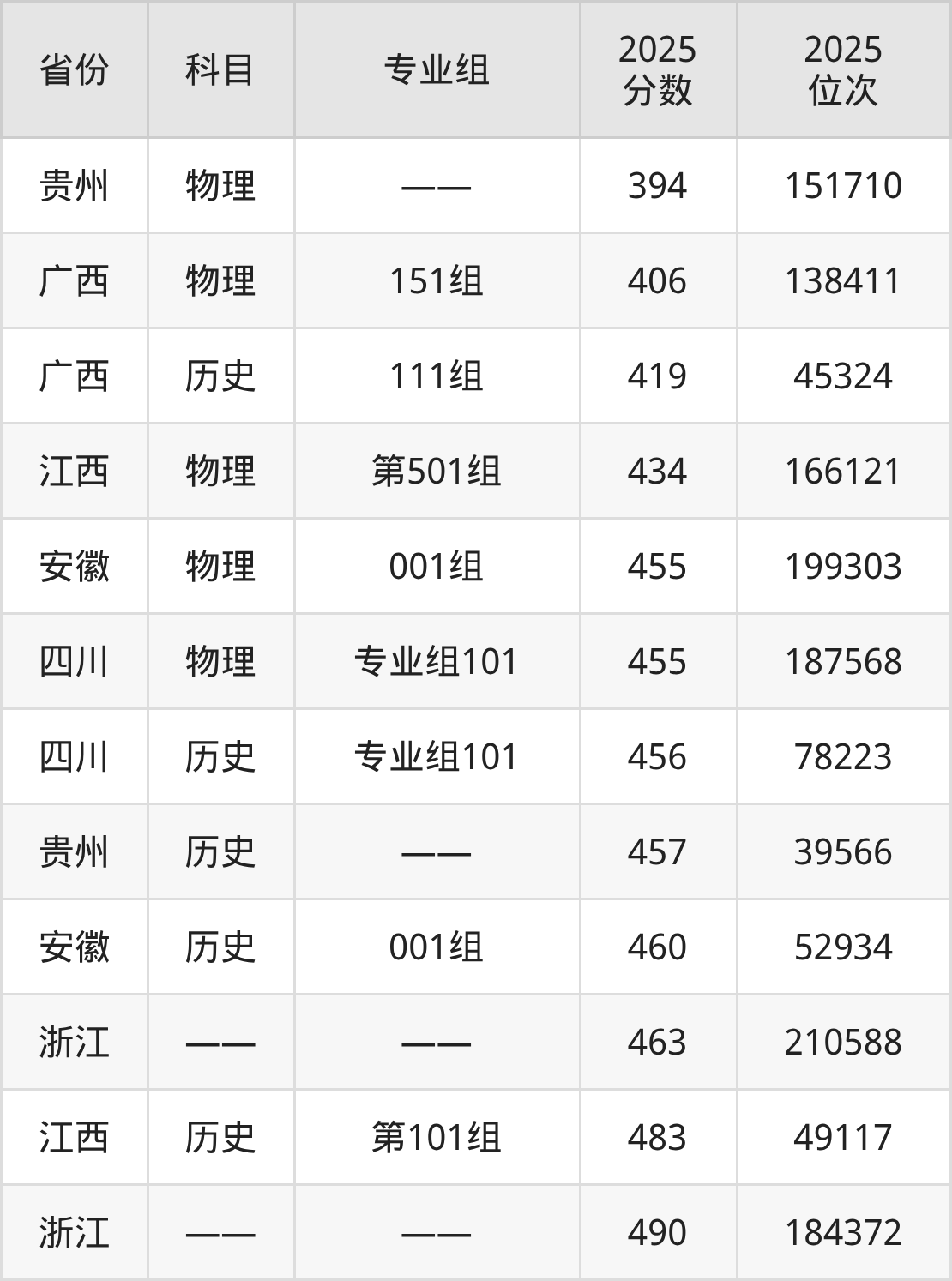 物理类:2025年杭州科技职业技术学院录取最低分是394分(贵州),对应的位次排名是151710名。