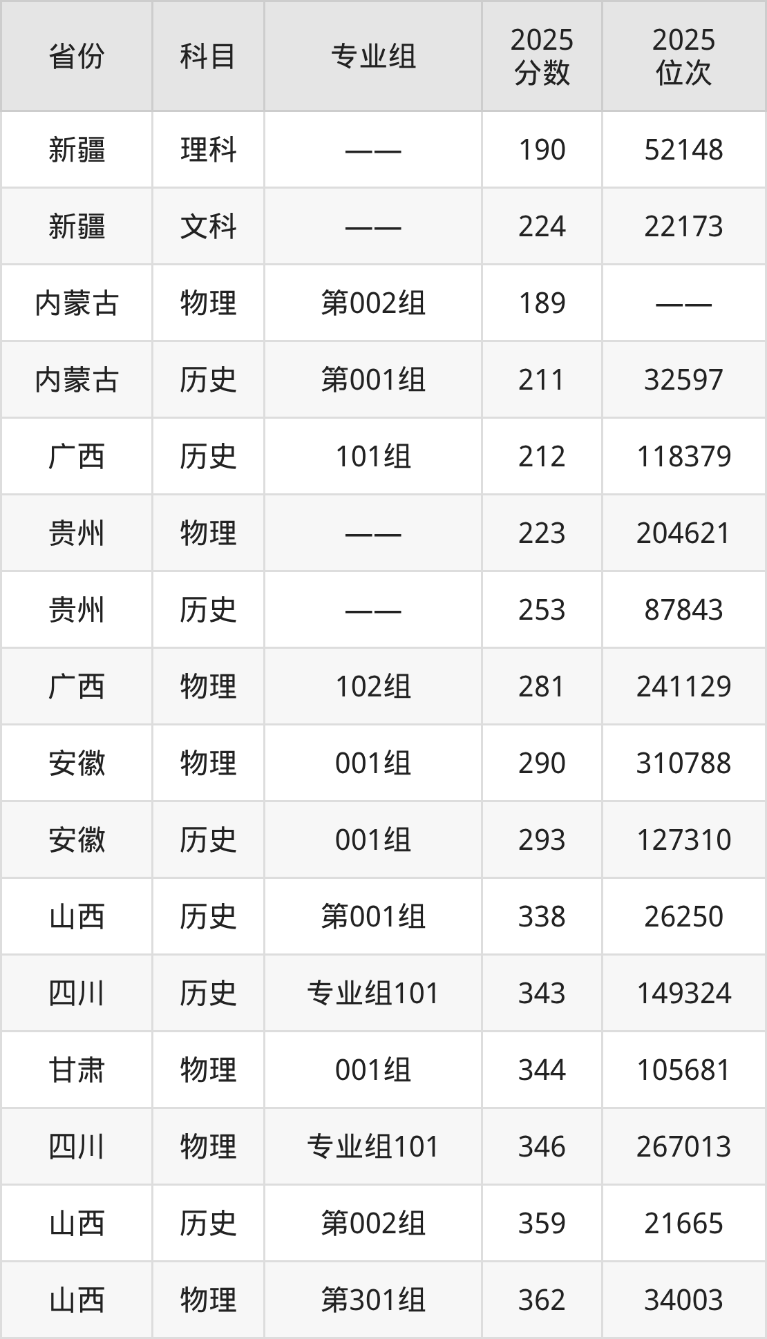 理科:2025年包头职业技术学院录取最低分是190分(新疆),对应的位次排名是52148名。