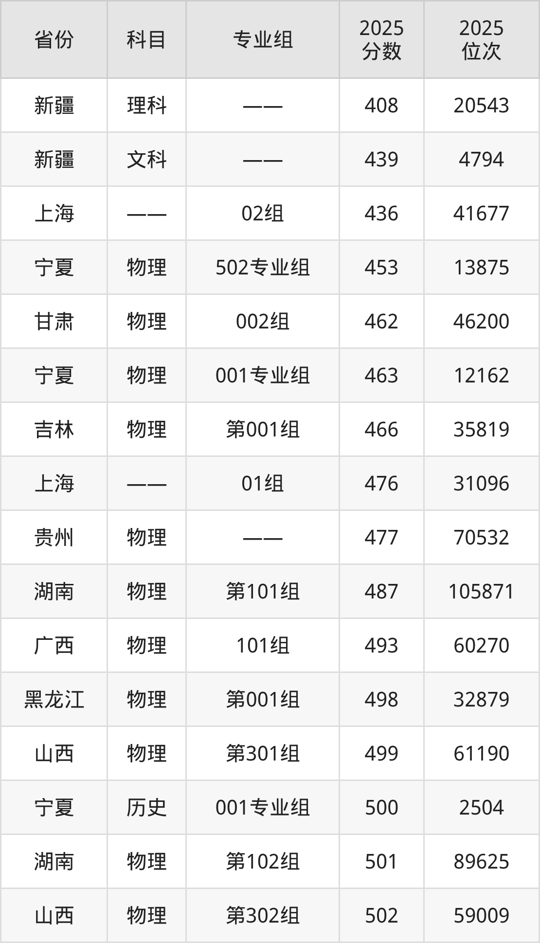 理科:2025年安徽农业大学录取最低分是408分(新疆),对应的位次排名是20543名。