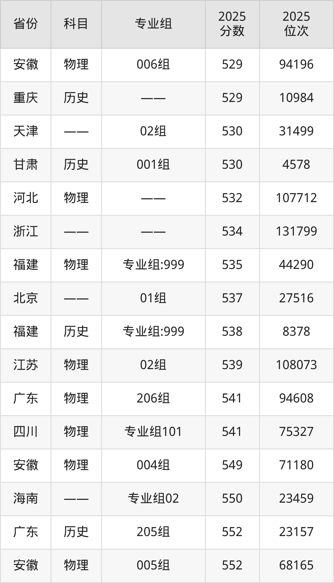 物理类:2025年安徽农业大学省内录取最低分是529分,对应的位次排名是94196名。建议:如果2026年排名超过94196名,那么被该校录取的概率较大。