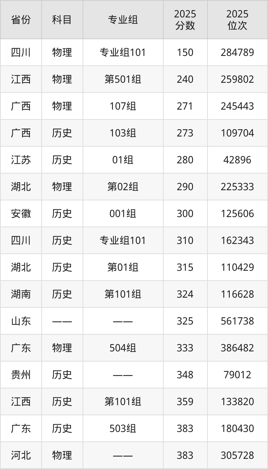 物理类:2025年吉安幼儿师范高等专科学校录取最低分是150分(四川),对应的位次排名是284789名。